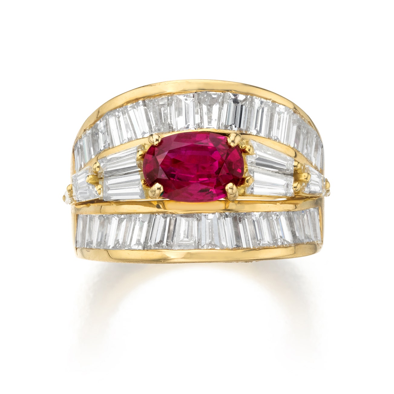 Set with an oval sapphire, weighing 1.76 carats, accented by brilliant-cut, baguette, and tapering baguette-cut diamonds, mounted in 18k yellow gold, size 7.25.