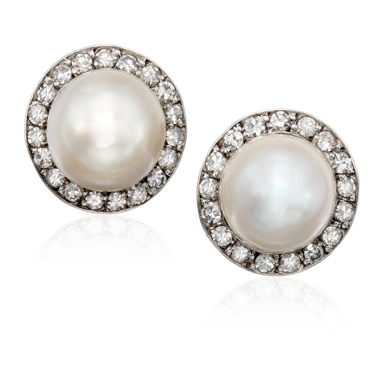 Each set with a natural button pearl measuring 10.26 x 10.23 x 9.26 mm. and 10.73 x 10.50 x 8.76 mm. respectively, within a frame of single-cut diamonds, mounted in platinum, posts and push back fittings.