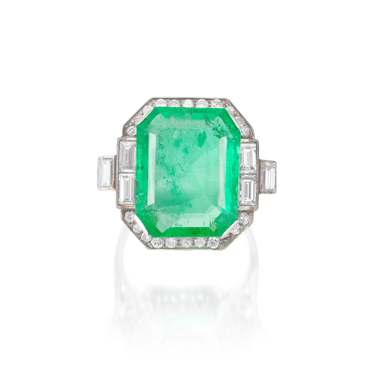 Set with an octagonal step-cut emerald, accented by a frame of circular-cut and baguette diamonds, mounted in platinum, ring size 7¾, one diamond deficient.