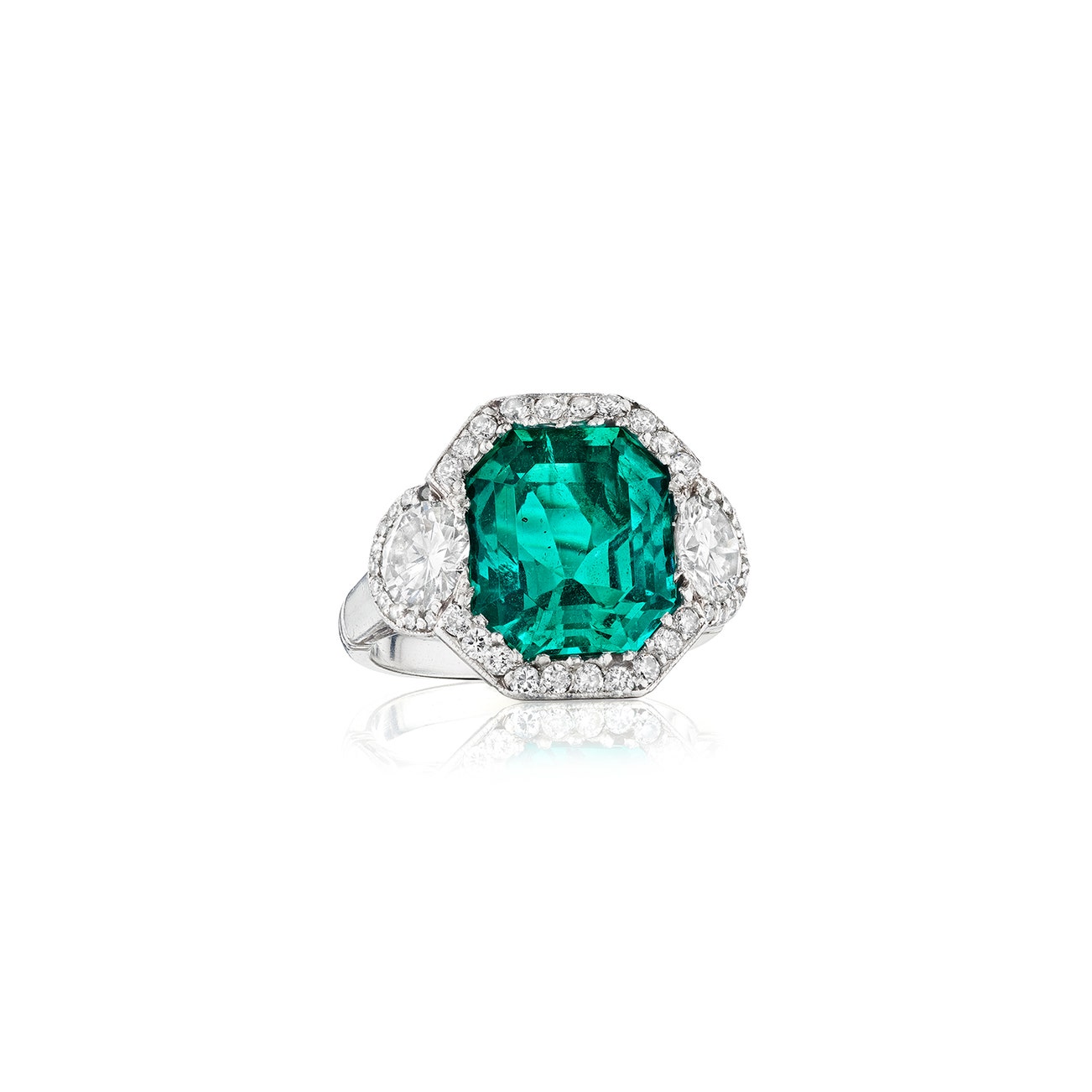 Set with a rectangular step-cut emerald, flanked by old-cut diamonds, within a frame of single- and circular-cut diamonds, mounted in platinum, size 5.