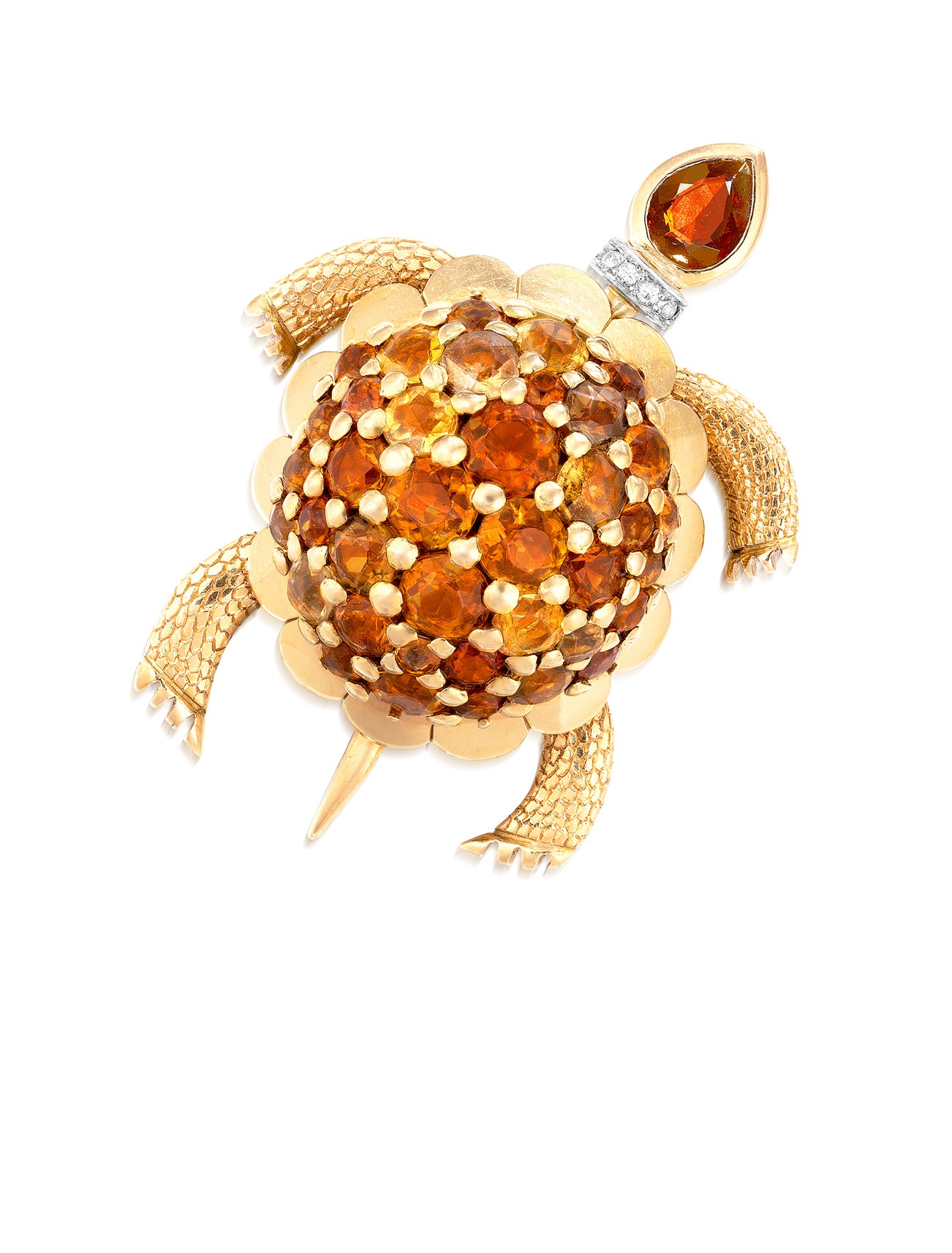 Designed as a turtle, the head set with a pear-shaped tourmaline, the body set with circular-cut citrines, accented with brilliant-cut diamonds, mounted in gold, French assay mark and maker's mark, length and width approximately 50 mm and 37 mm respectively.