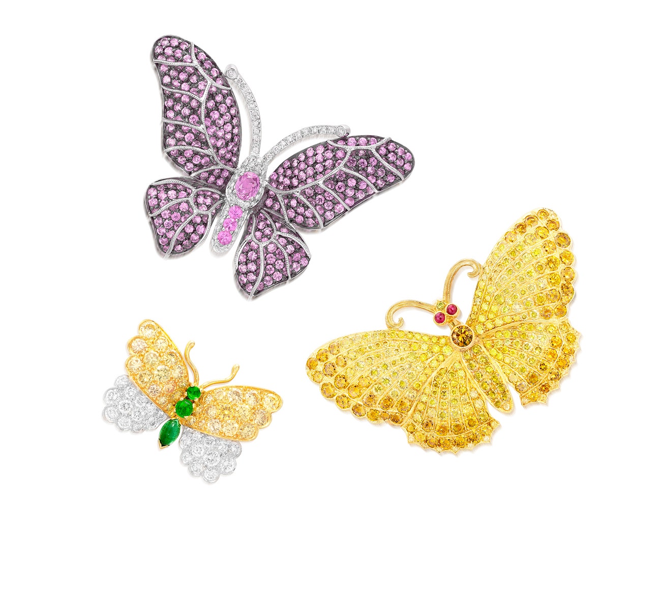 Each designed as a butterfly, the first brooch set with circular-cut and oval pink sapphires, accented by brilliant-cut diamonds, mounted in white gold and oxidized white gold, length and width approximately 39 mm and 53 mm respectively; the second brooch set with brilliant-cut diamonds of yellow and orange tint, accented by cabochon ruby eyes, mounted in gold, length and width approximately 33 mm and 52 mm respectively; and the third brooch with upper wings set with brilliant-cut diamonds of yellow tint and lower wings set with near-colorless diamonds, accented by the body set with round and marquise-shaped cabochon emerald, mounted in platinum and gold, length and width approximately 21 mm and 29 mm respectively; two brooches with pendant fittings.