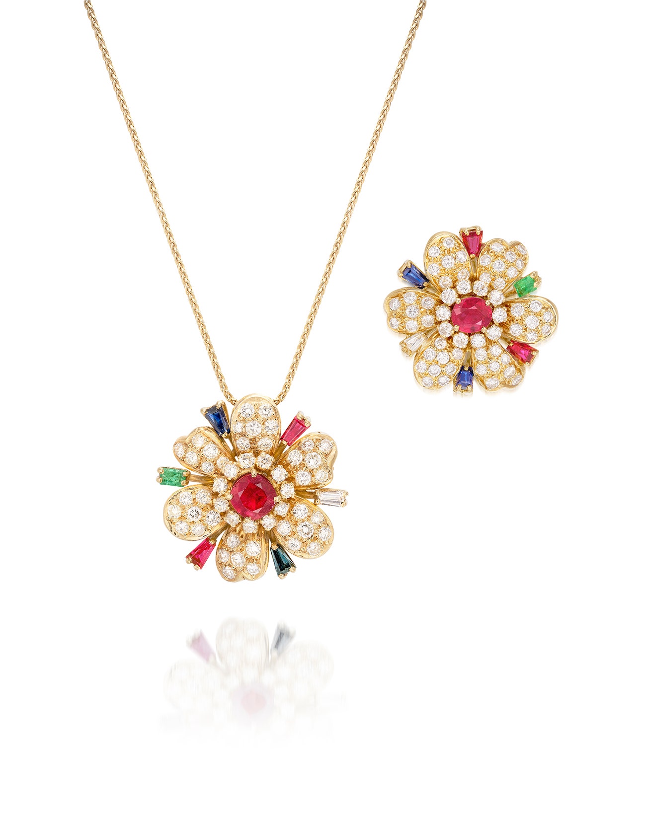 Of floral design, comprising: a pendant centring on a cushion-shaped ruby, within a surround of brilliant-cut diamonds, the petals pavé-set with brilliant-cut diamonds, accented with tapered baguette emerald, rubies, sapphires and diamond, together with a gold chain; and a brooch en suite, mounted in gold, necklace length approximately 438mm, pendant length and width approximately 28 mm and 28 mm respectively, brooch length approximately 25 mm.