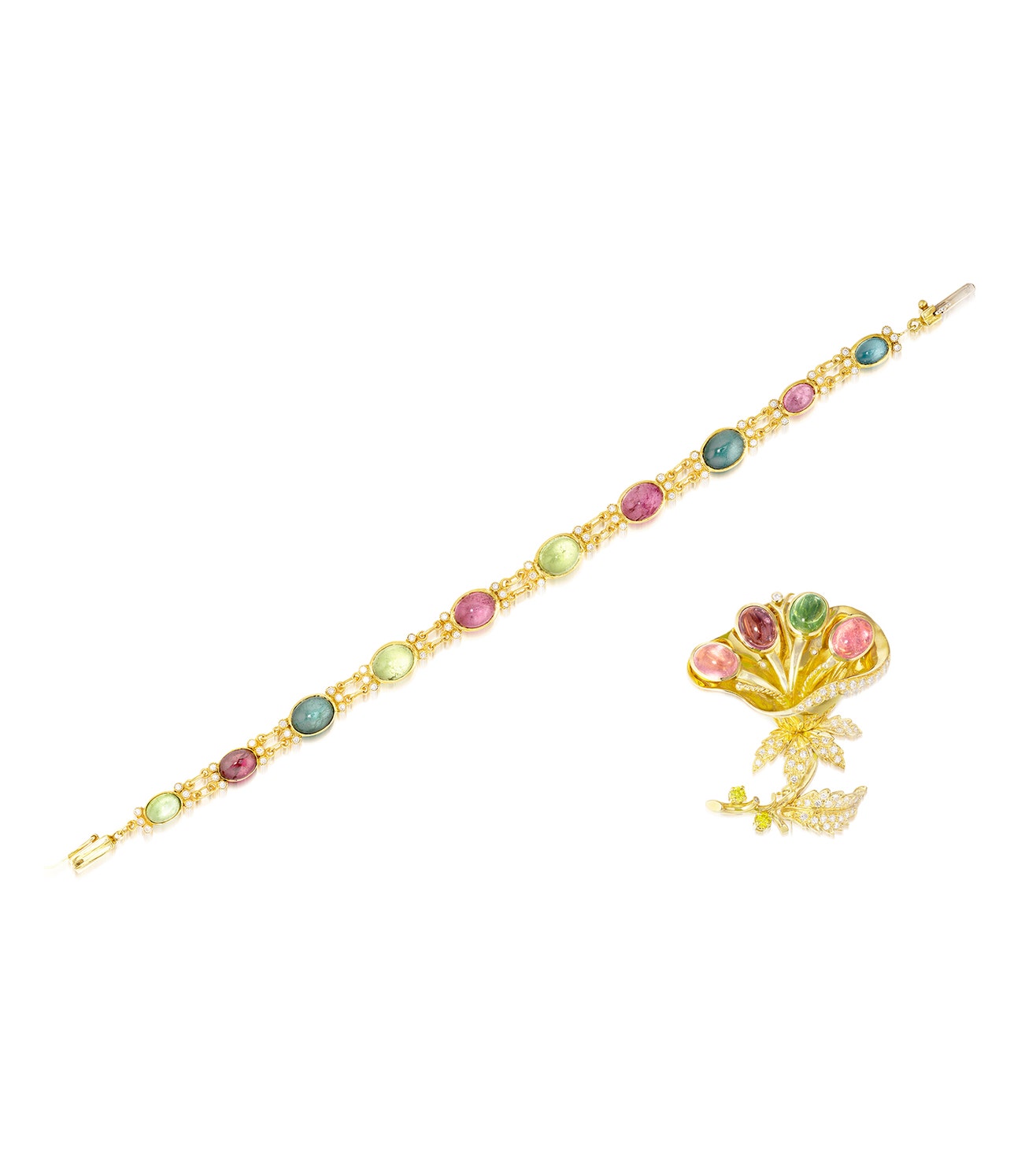 The brooch of floral design, the pistils set with cabochon pink, purple and green tourmalines, the flower head and leaves highlighted with brilliant-cut diamonds, the stem set with brilliant-cut diamonds of yellow tint; the bracelet designed as a series of blue, pink, purple and green tourmaline cabochons, between collet-set brilliant-cut diamonds, mounted in gold, bracelet length approximately 200mm, brooch length and width approximately 46 mm and 39mm respectively.