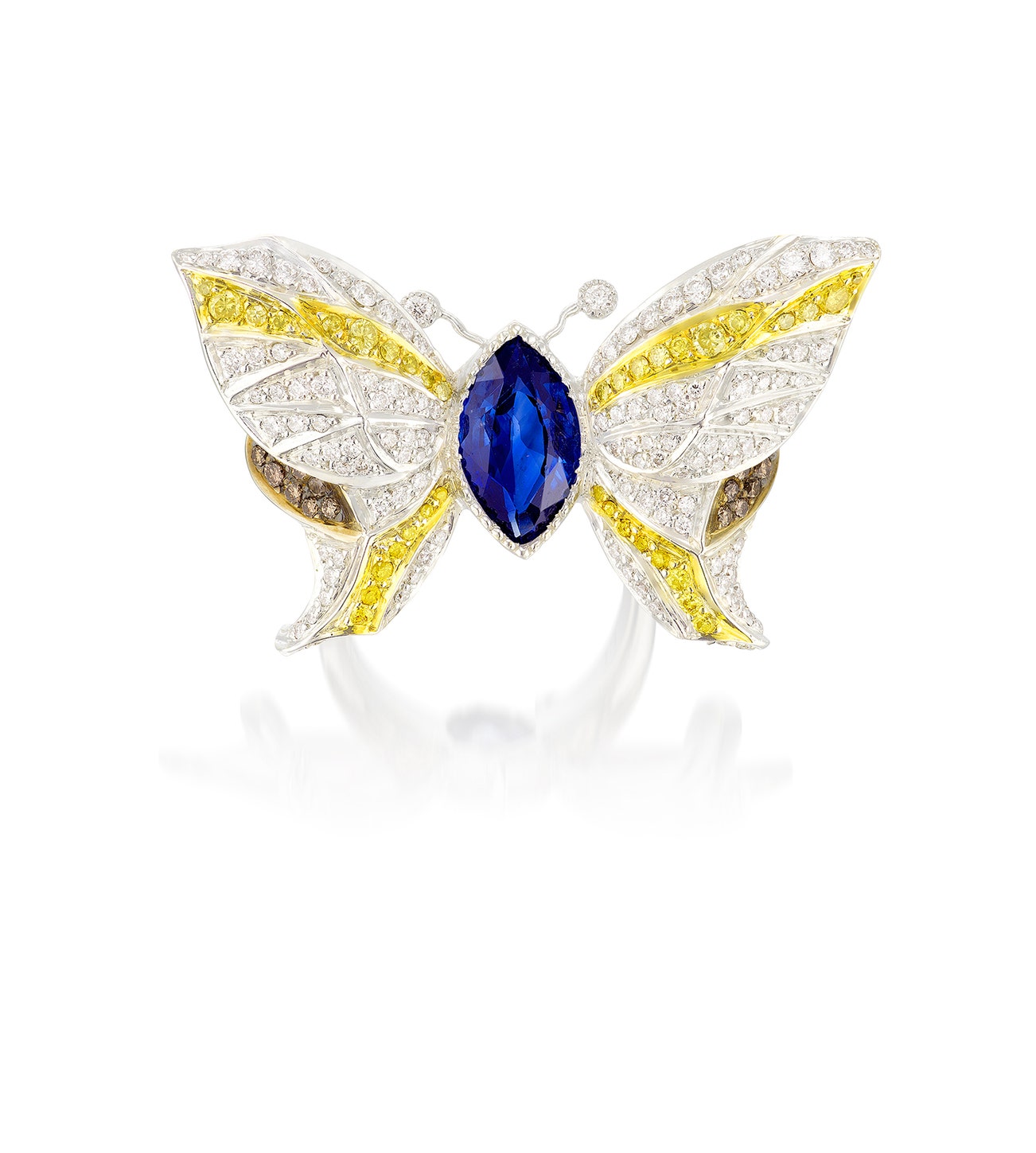 Designed as a butterfly, the body millegrain-set with a marquise-shaped sapphire stated to weigh 2.74 carats, the wings set with brilliant-cut diamonds and diamonds of yellow tint, mounted in white gold, size 6.