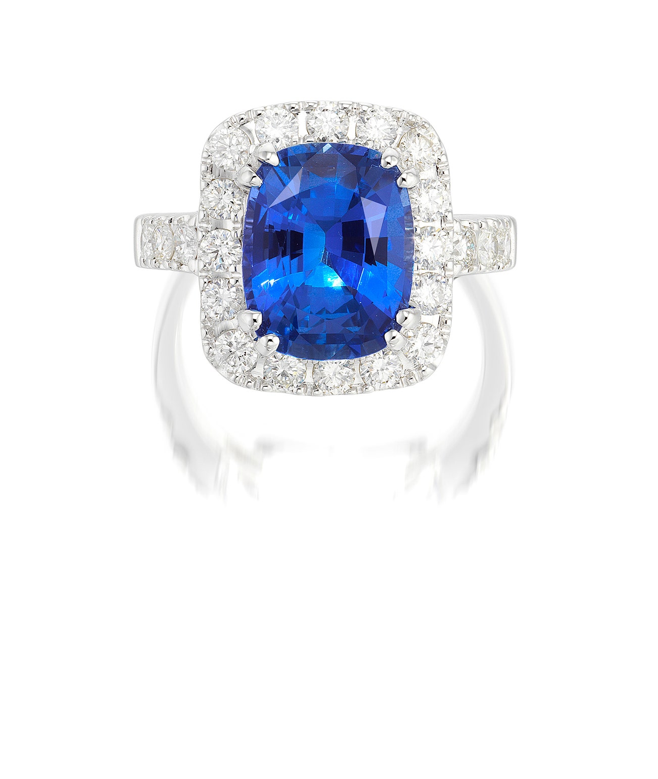 Set with a cushion-shaped sapphire, within a brilliant-cut diamond surround, between brilliant-cut diamond shoulders, mounted in white gold, size 6.