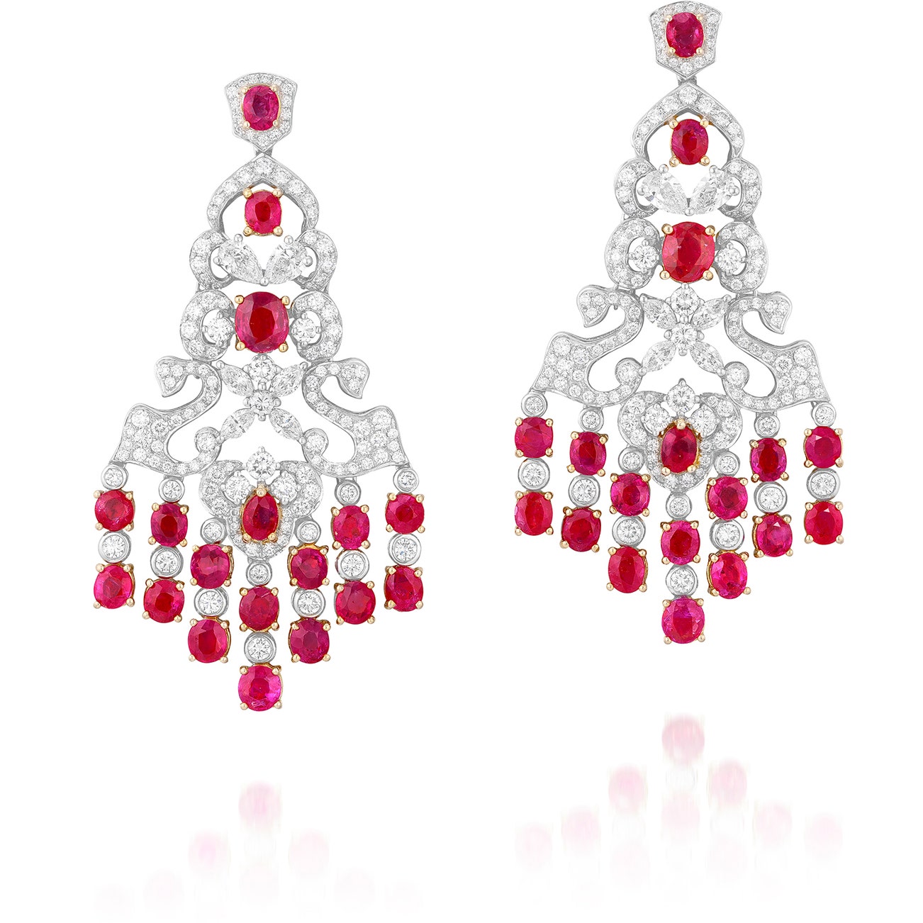 Each of chandelier design, set with oval rubies and pear-, marquise-shaped and brilliant-cut diamonds, mounted in yellow and white gold, post and butterfly fittings, length approximately 60 mm.