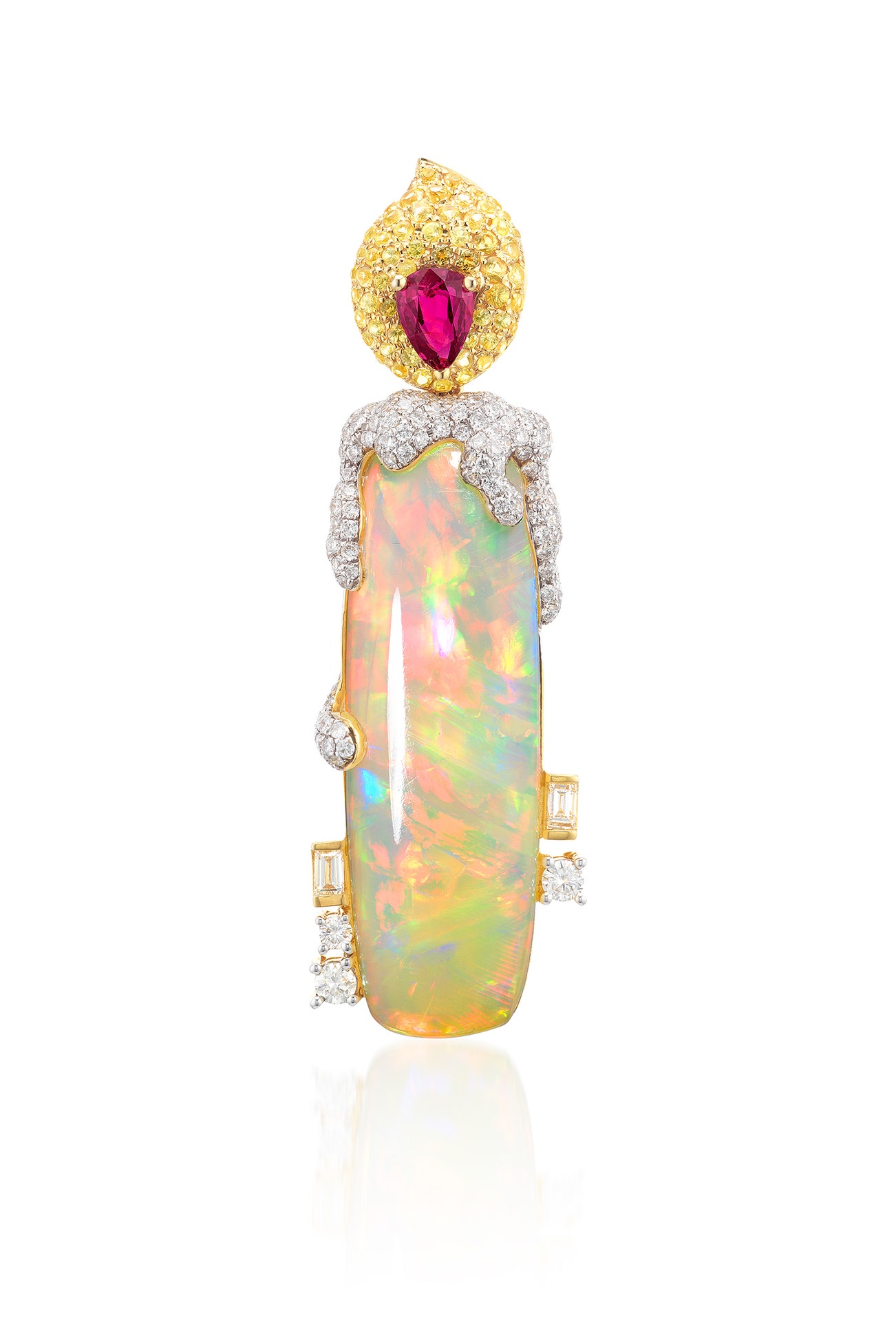 Designed as a candle, set with an elongated cabochon opal, highlighted with brilliant-cut and baguette diamonds, the flame set with circular-cut sapphires of yellow tint and a pear-shaped ruby, mounted in gold and white gold, length approximately 54 mm.