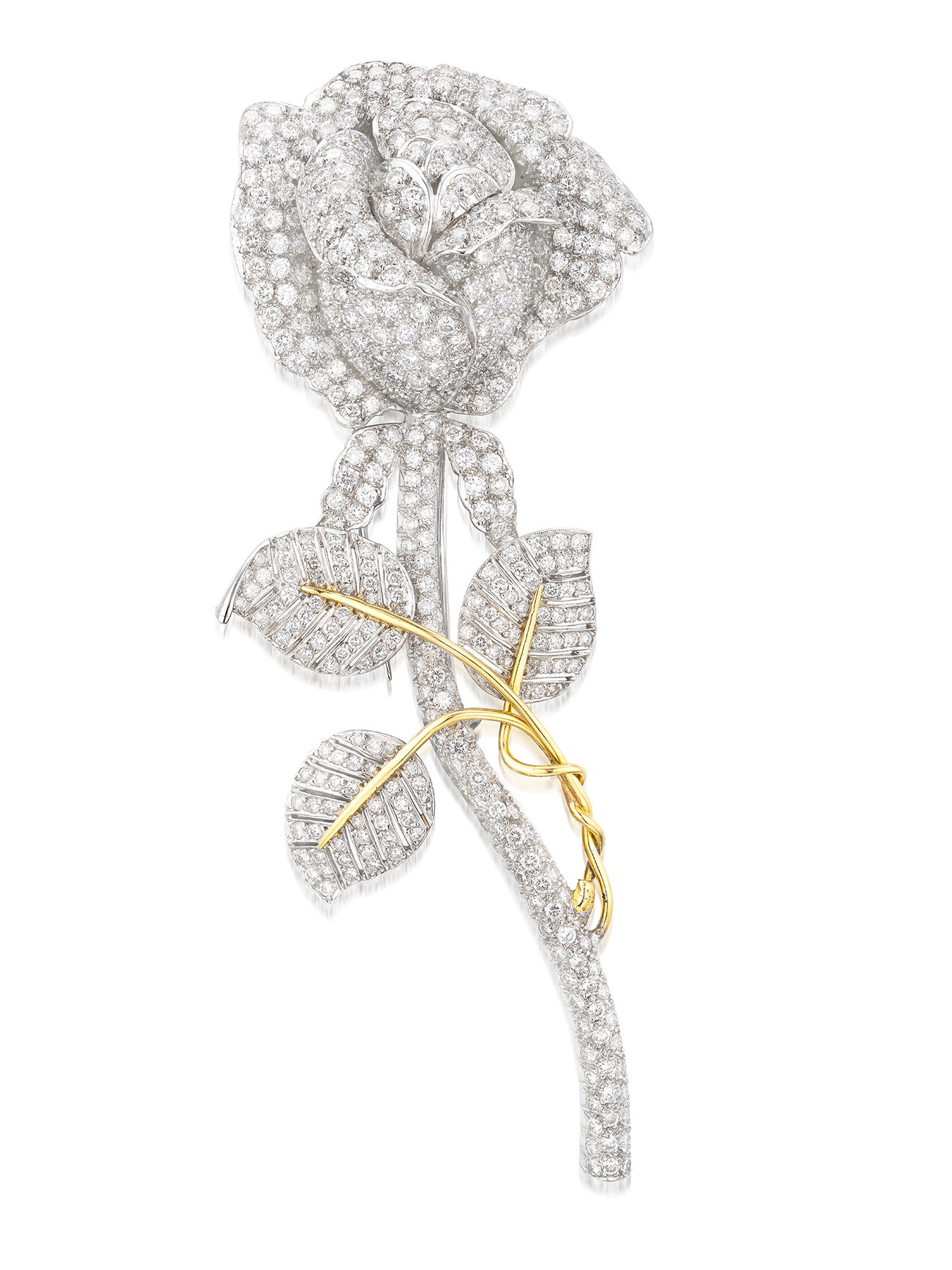 Designed as a rose, set throughout with brilliant-cut diamonds, highlighted with a polished gold petioles, mounted in platinum and gold, length approximately 100 mm.