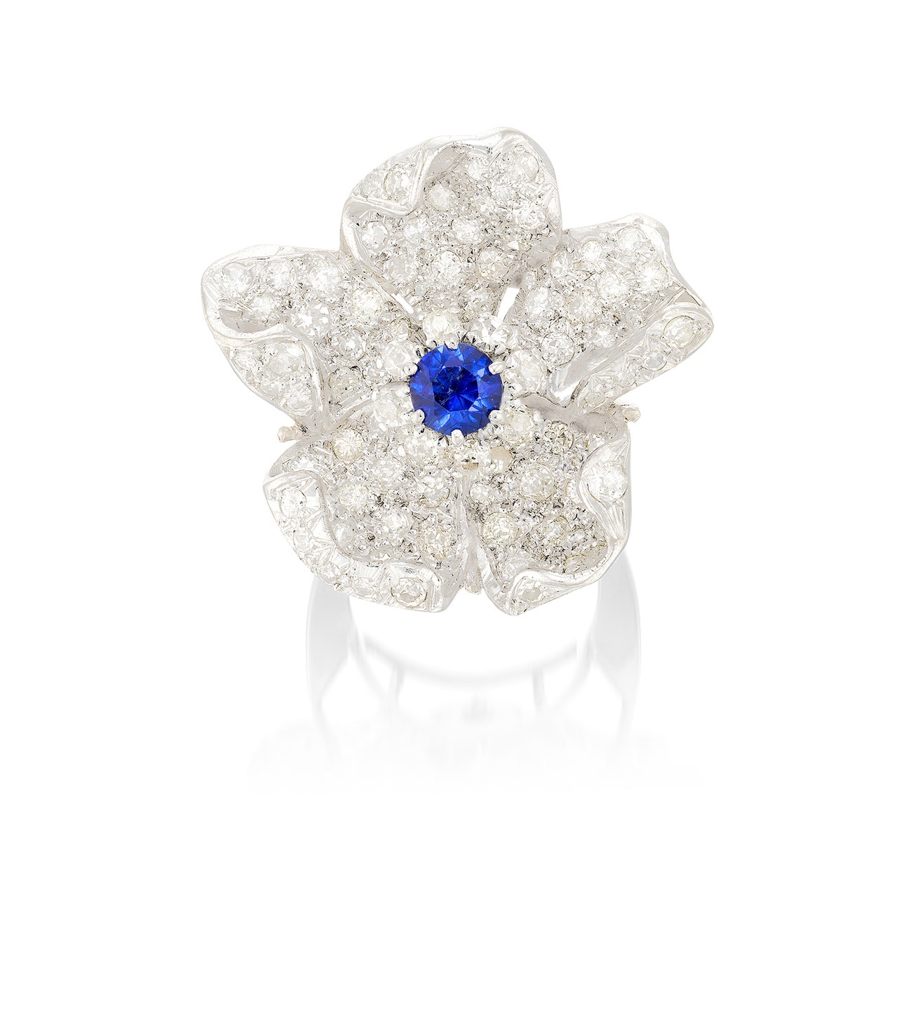 Set at the center with a circular-cut sapphire, within a single- and old European-cut diamond surround and petals, mounted in white gold, size 8.