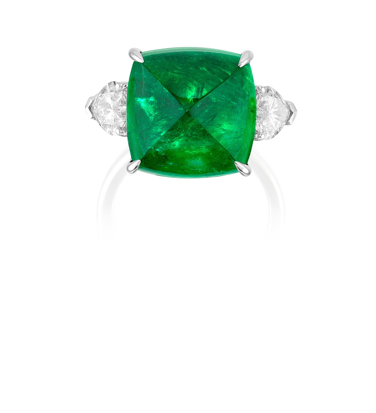 Set with a sugarloaf double cabochon emerald, between two heart-shaped diamonds, mounted in white gold, size 6¾.