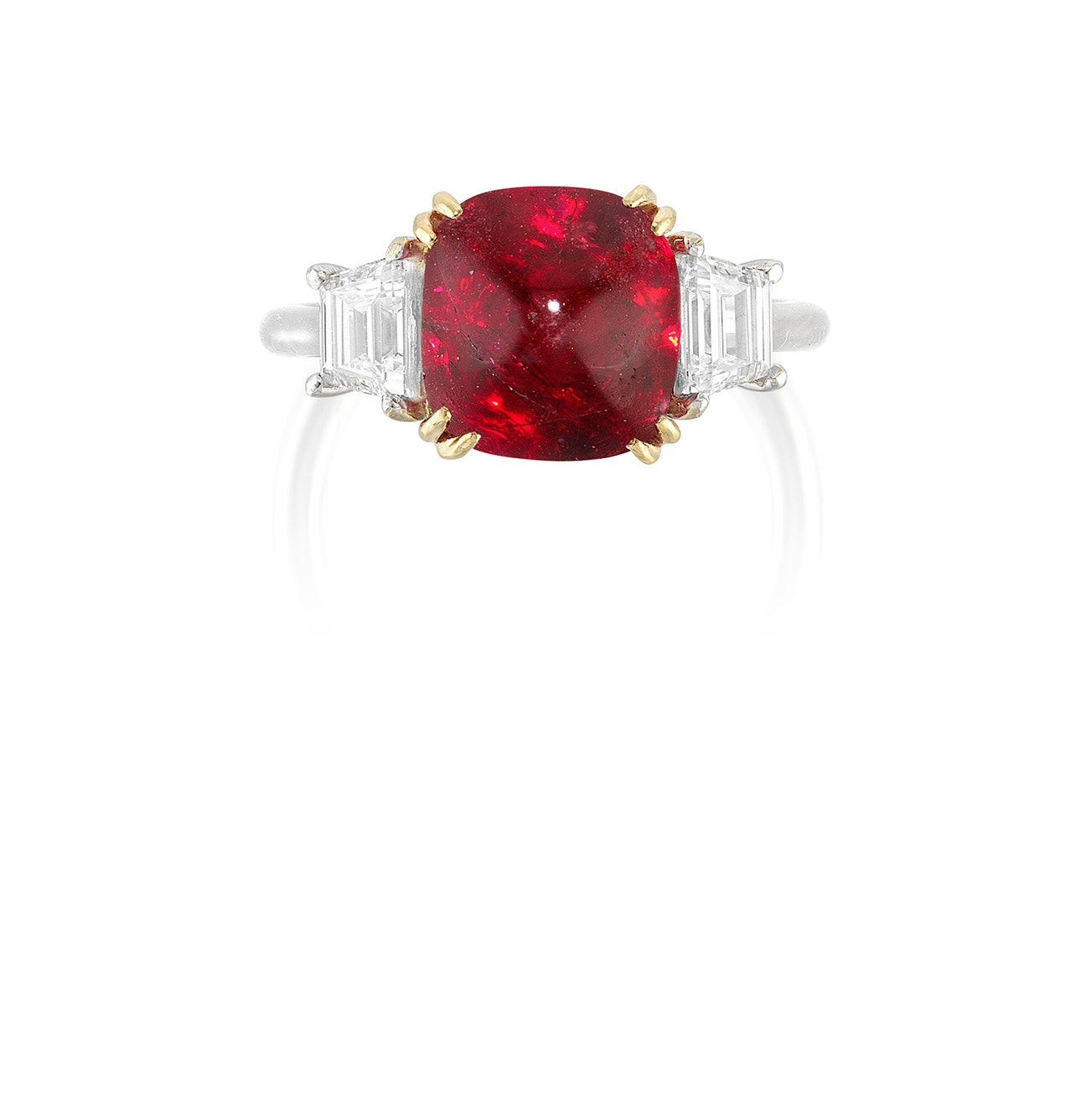 Set with a sugarloaf red spinel weighing 6.87 carats, between trapezoid-shaped diamonds, mounted in gold and white gold, size 6½.