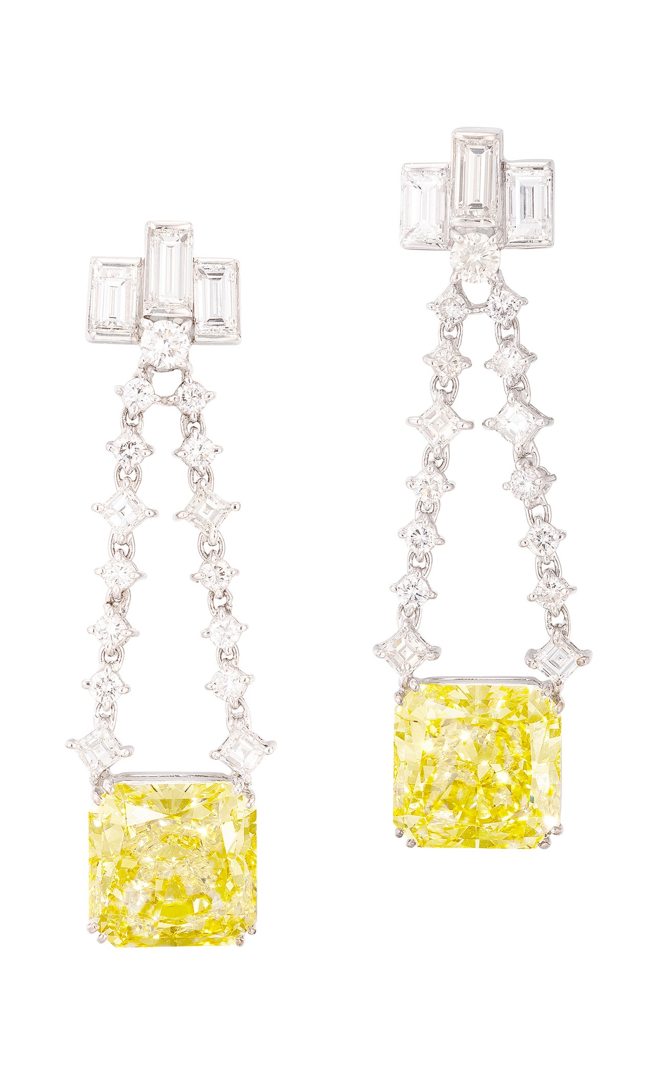 Each set with a cut-cornered square modified brilliant-cut fancy intense yellow diamond weighing approximately 7.05 and 7.28 carats respectively, suspended from articulated diamond-set links, further enhanced with baguette diamond surmount, mounted in white gold, post and butterfly fittings, length approximately 48 mm.