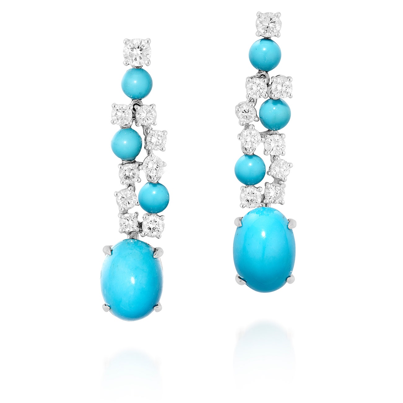 Each set with an oval cabochon turquoise, suspended from a line of brilliant-cut diamonds and turquoise beads, mounted in white gold, Italian assay mark, post and butterfly fittings, length approximately 36 mm.