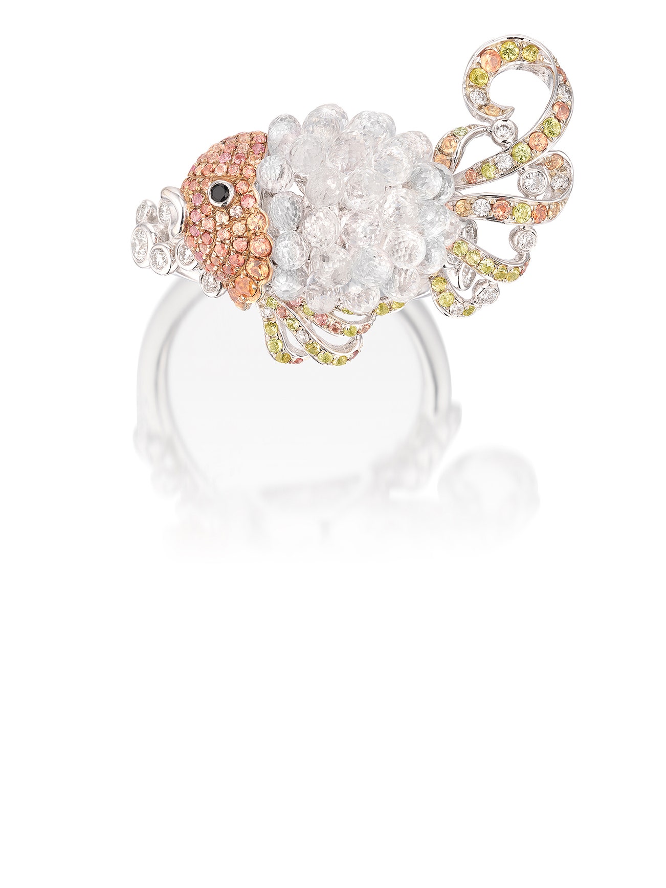 Designed as a goldfish, the body set with briolette white sapphires, the head, fin and tail set with brilliant-cut diamonds and circular-cut yellow and orange sapphires, accented by black diamond-set eye, mounted in white gold, size 6¼.