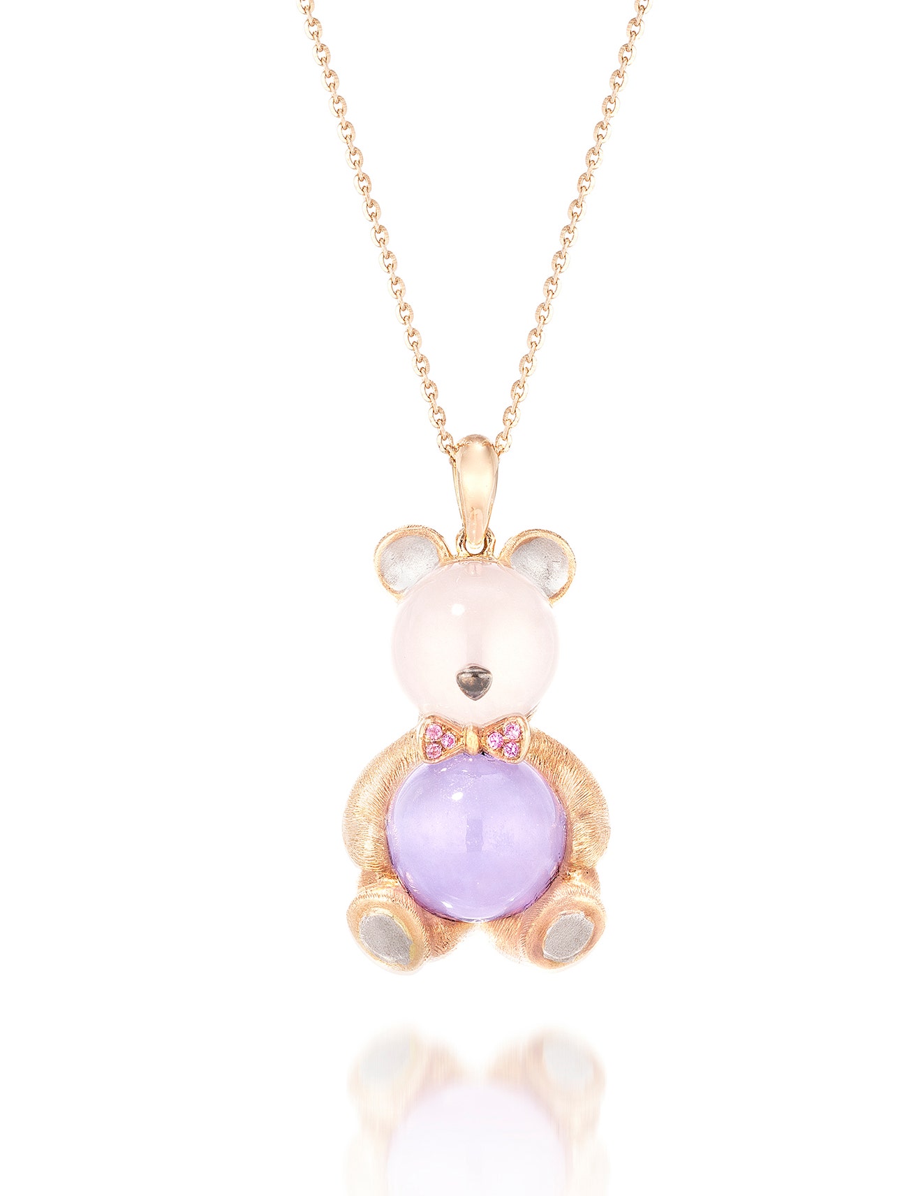 Designed as a teddy bear, the head set with a round icy jadeite cabochon of icy colourless material, measuring approximately 8.61 x 8.65 x 8.73mm, with very good translucency, the body set with a round lavender jadeite cabochon, measuring approximately 8.60 x 8.69 x 8.54 mm, of good translucency, highlighted with a bow-tie set with circular-cut pink sapphires, with textured pink and white gold limbs, ears and nose, together with a pink gold chain, mounted in pink and white gold, necklace length approximately 405 mm, pendant length approximately 26 mm.