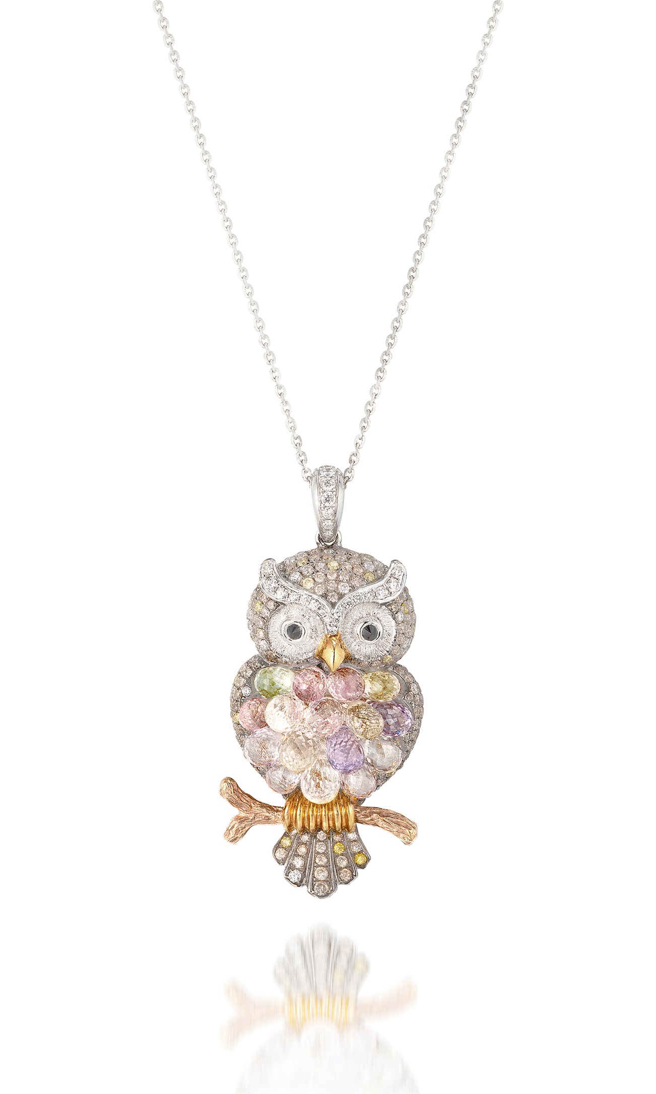 Designed as an owl perching on a branch, the body set with briolette white, pink, yellow and purple sapphires, highlighted with brilliant-cut diamonds, black diamonds and diamonds of brown tint, together with a white gold chain, mounted in gold, pink and white gold, necklace length approximately 405 mm, pendant length approximately 34 mm.