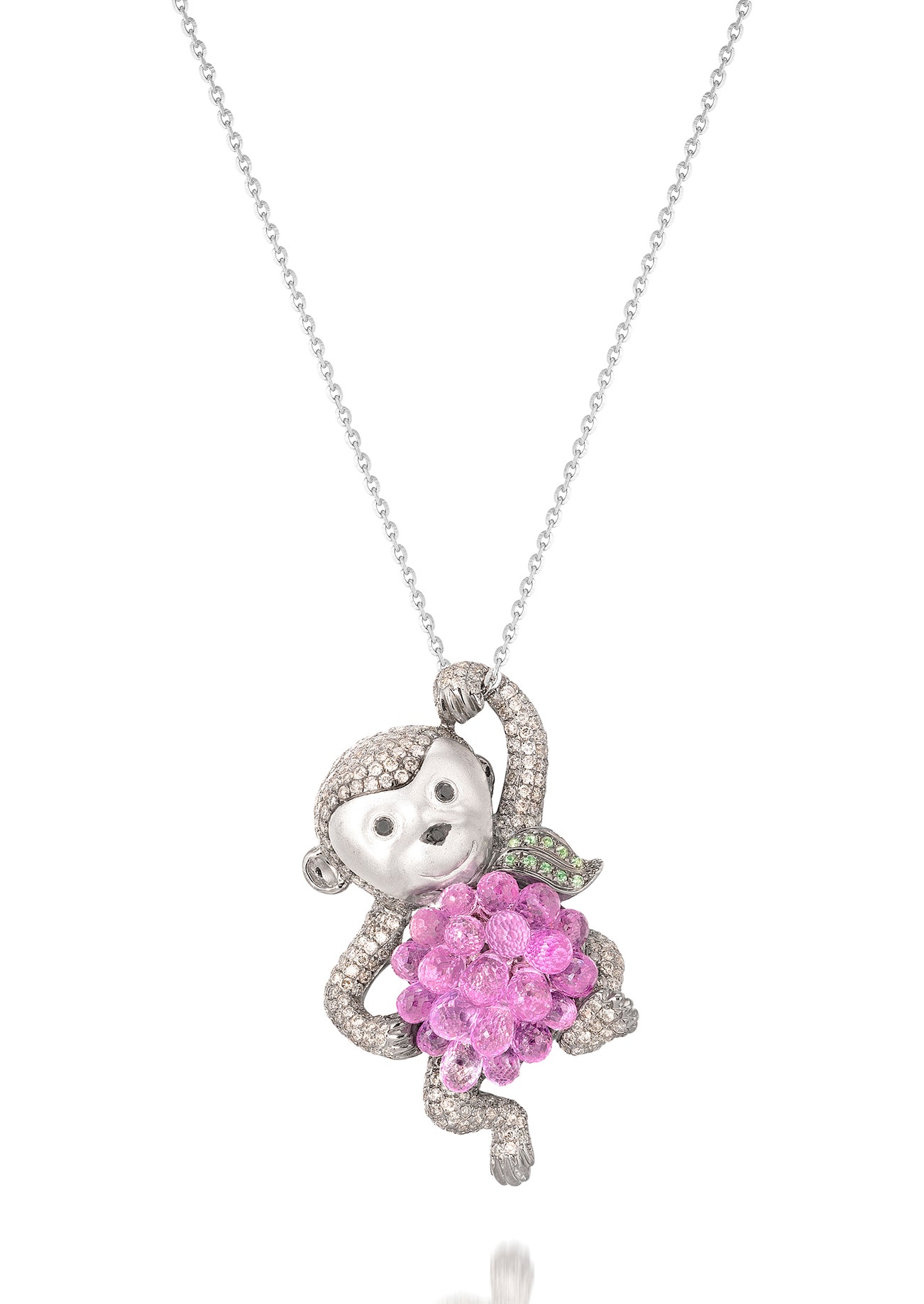 Designed as a whimsical monkey, the body highlighted with briolette pink sapphires, decorated by circular-cut diamonds, black diamonds and green garnets, together with a white gold chain, mounted in white gold and oxidized white gold, necklace length approximately 405 mm, pendant length approximately 29 mm.
