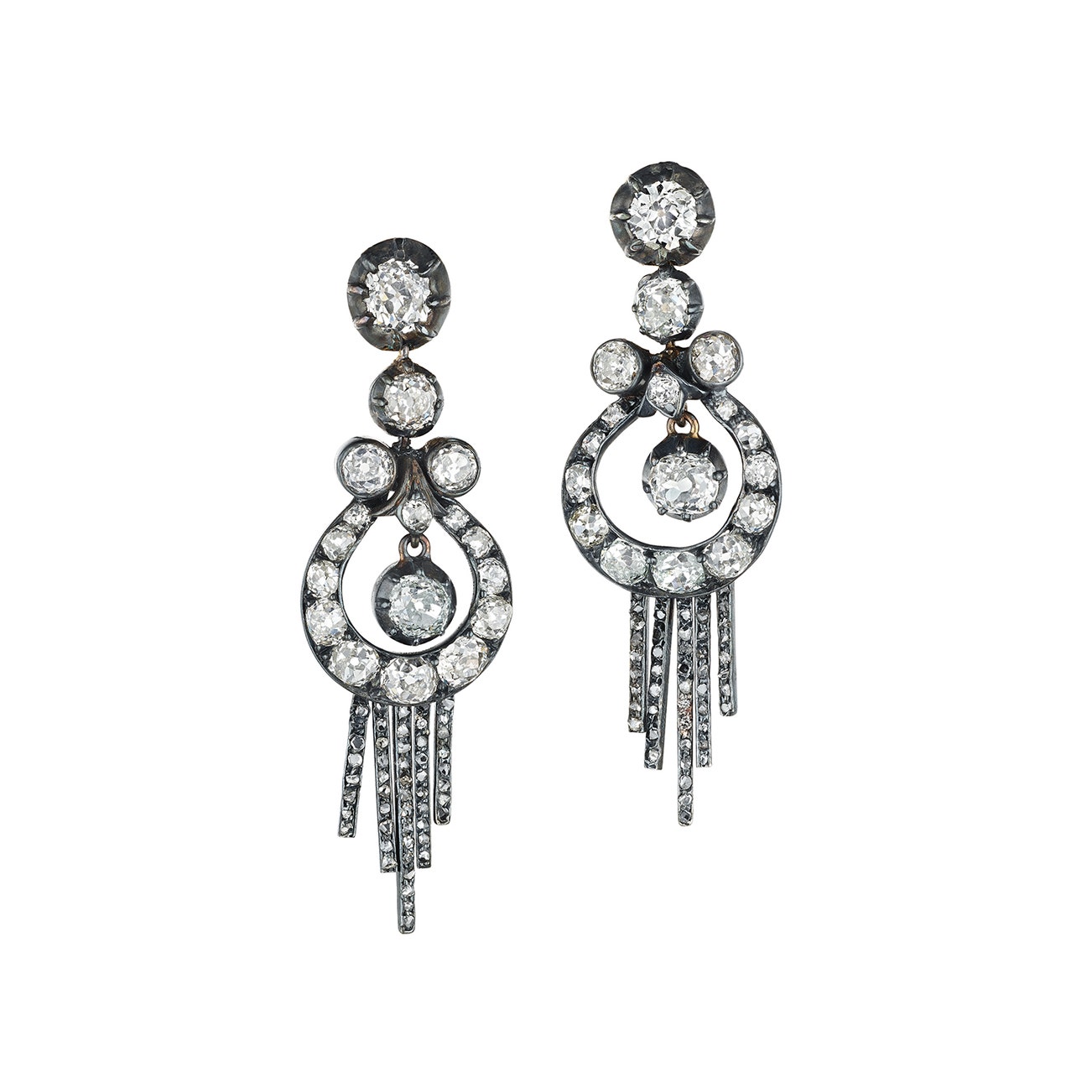 Each set with old-cut diamonds, suspending an old-cut diamond within, supporting fringe set with rose-cut diamonds, surmounted by a line of old-cut diamonds, mounted in in silver-topped 14K yellow gold, hinge back fittings.
