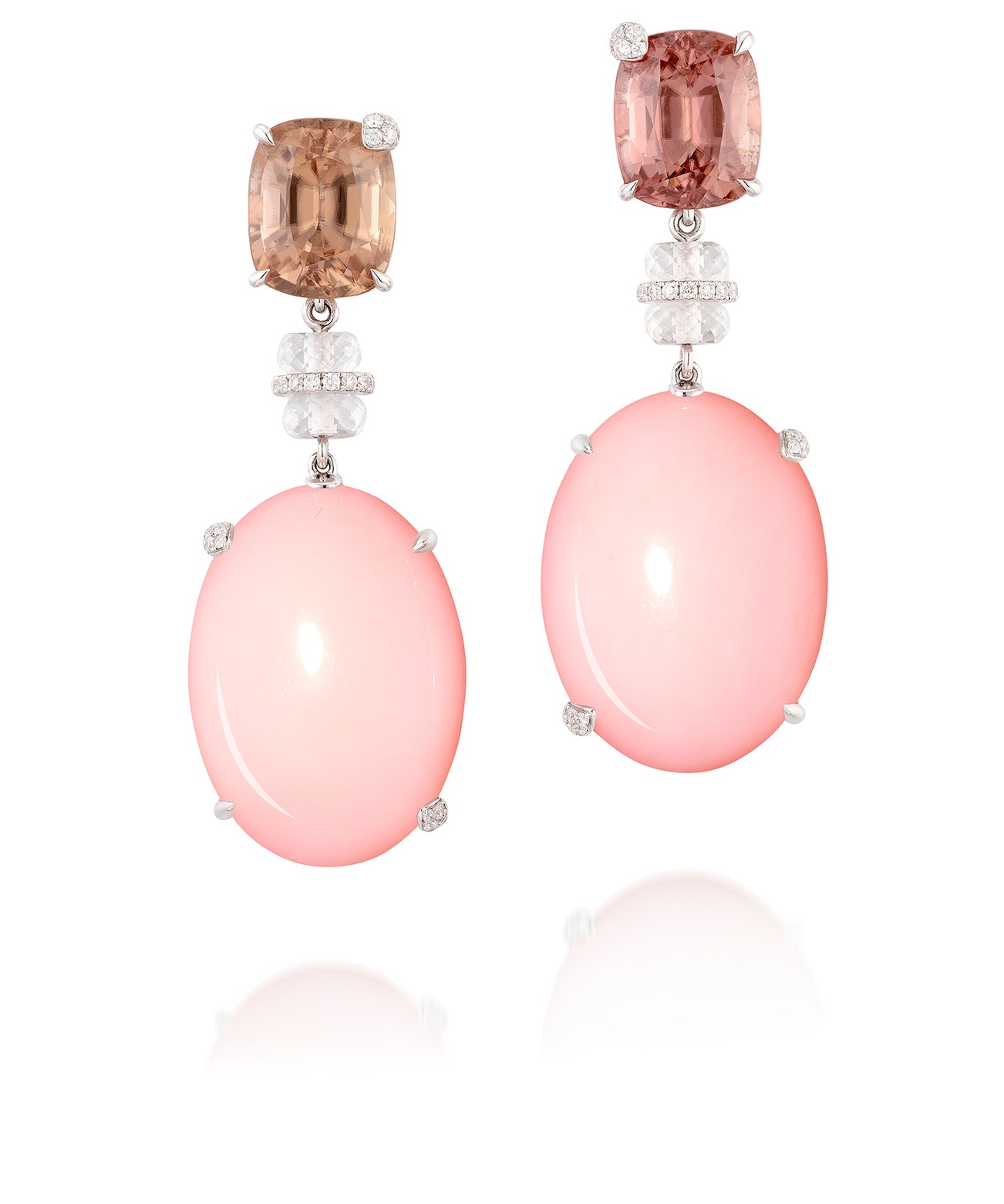 Each set with an oval cabochon pink opal, decorated by brilliant-cut diamonds, suspended from a cushion-shaped zircon, highlighted with brilliant-cut diamonds, connected by white topaz rondelles and diamond-set spacers, mounted in white gold, post and butterfly fittings, length approximately 46 mm, pendants detachable.