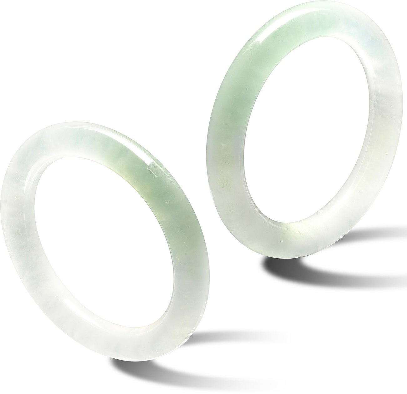 Two circular colourless jadeite bangles of high translucency, with light green patches, inner circumference approximately 170 mm each.