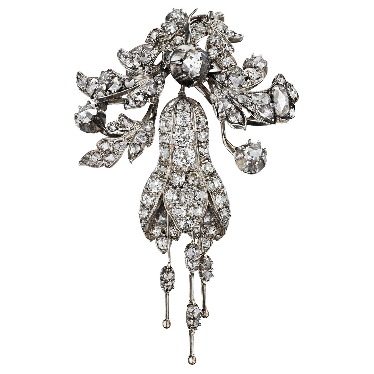 Designed as a bell flower set with cushion-shaped diamonds, suspending tendrils set with rose-cut diamonds, surmounted by rose-cut diamond-set leaves, further accented by singular rose-cut diamonds, mounted in silver topped 14K yellow gold, fitted case.