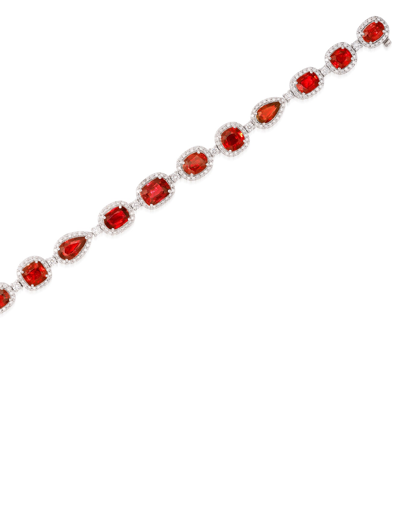 Set with twelve oval, cushion- and pear-shaped red spinels, framed and spaced by brilliant-cut diamonds, mounted in white gold, length approximately 157 mm.