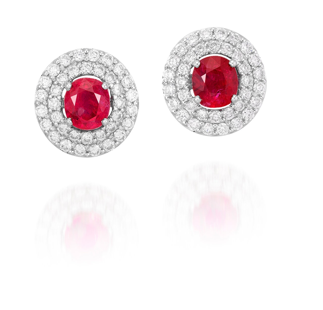 Each set with an oval ruby weighing approximately 1.08 and 1.13 carats respectively, within a double frame of brilliant-cut diamonds, mounted in white gold, post and butterfly back fittings, length approximately 12 mm.