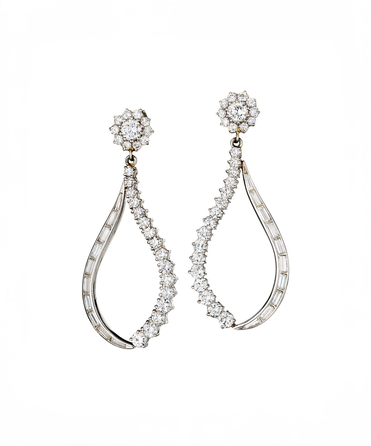 Each top set with a brilliant-cut diamond surrounded by brilliant-cut diamonds, suspending detachable pendants, set with baguette and brilliant-cut diamonds, mounted in platinum, screw back fittings.