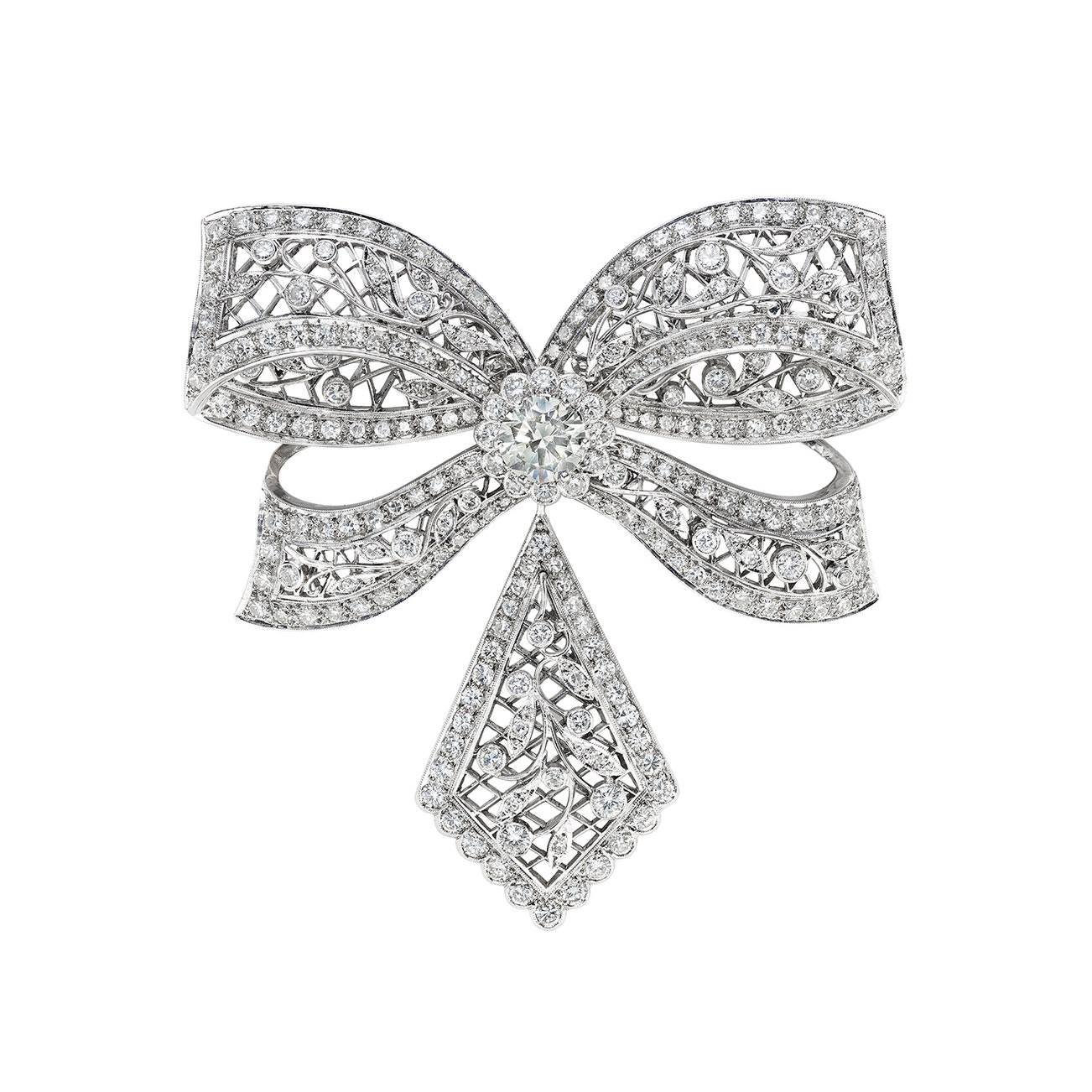 Designed as a bow, centering a circular-cut diamond weighing approximately 1.61 cts., surrounded by brilliant-cut diamonds, enhanced by brilliant-cut and single-cut diamonds supporting lattice work and vines set with brilliant-cut and single-cut diamonds, mounted in 14K white gold.
