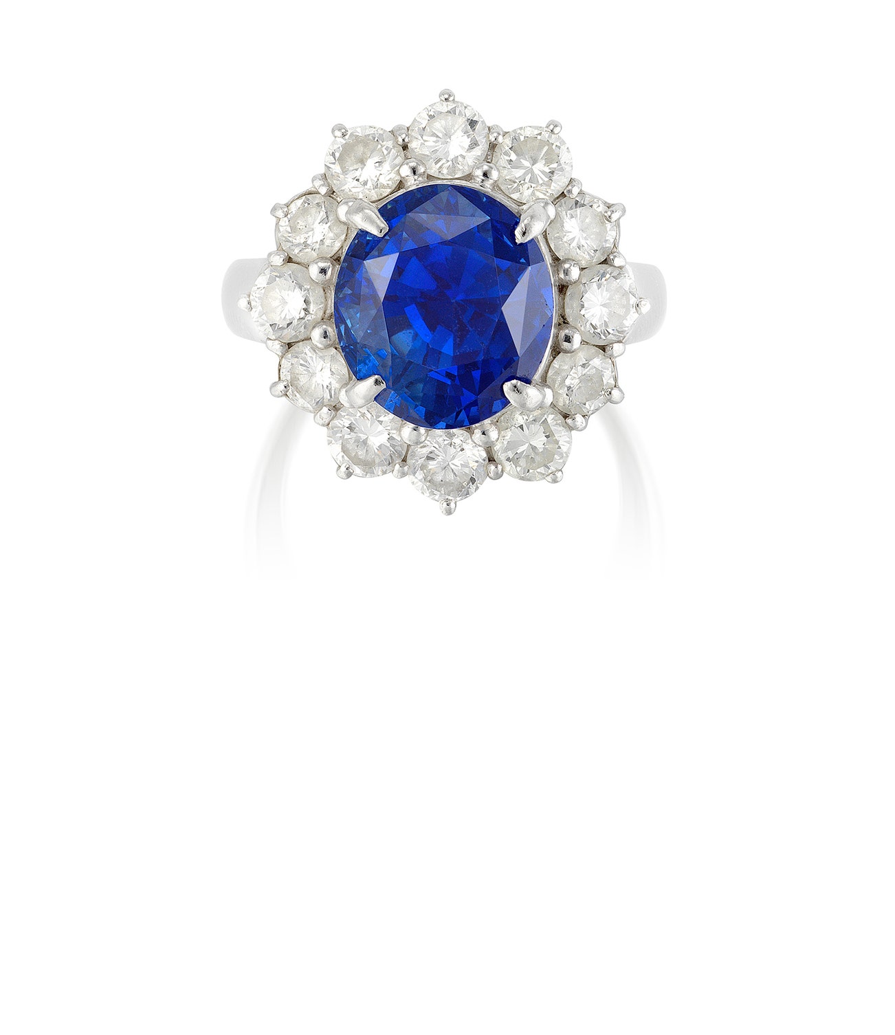 Set with a modified brilliant-step-cut sapphire, within a brilliant-cut diamond surround, mounted in platinum, size 5¼.