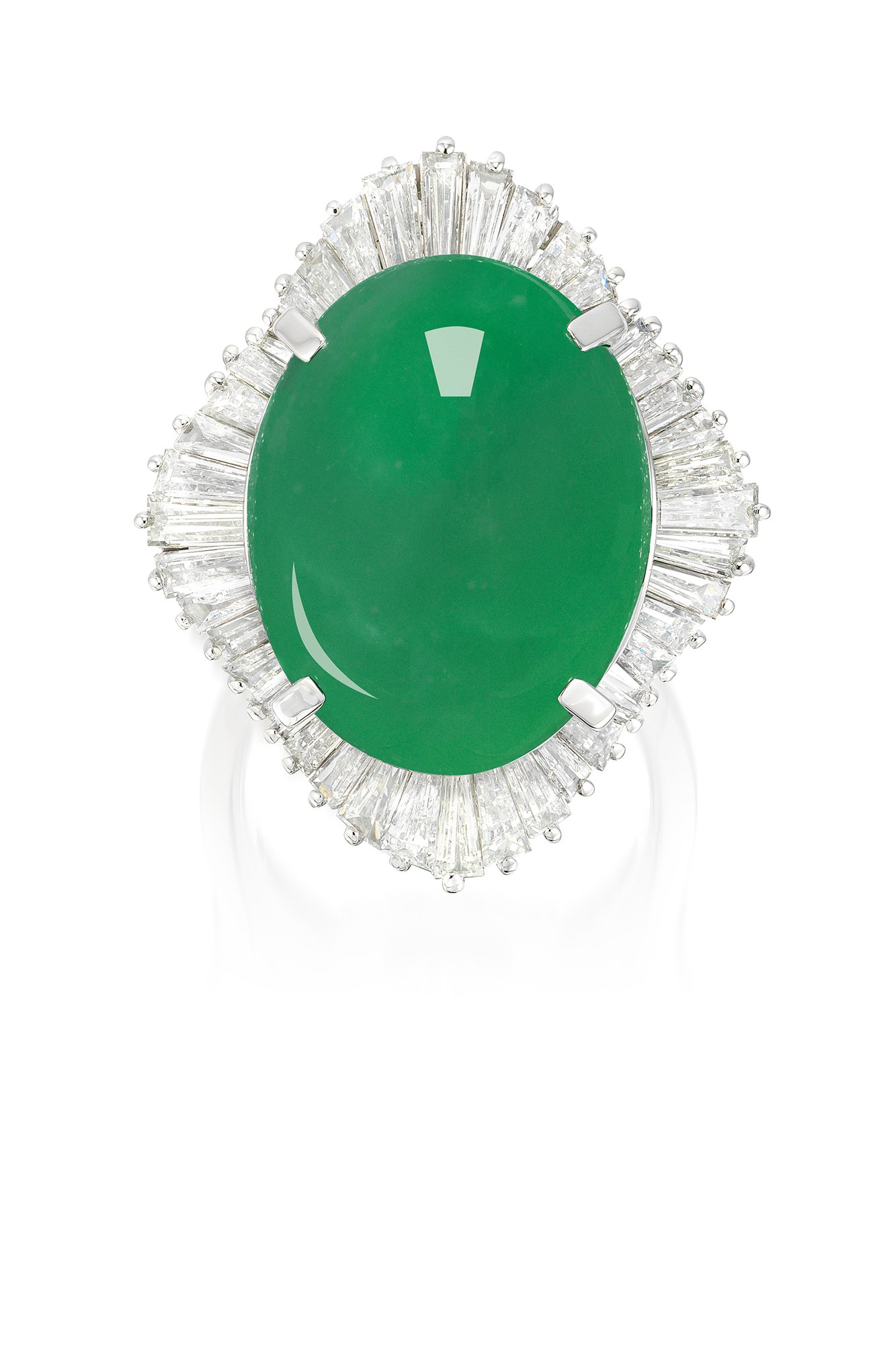 Set with an oval jadeite cabochon, measuring approximately 22.84 x 17.65 x 11.28 mm, within a ballerina-setting of tapered baguette diamonds, mounted in platinum, size 6¼.