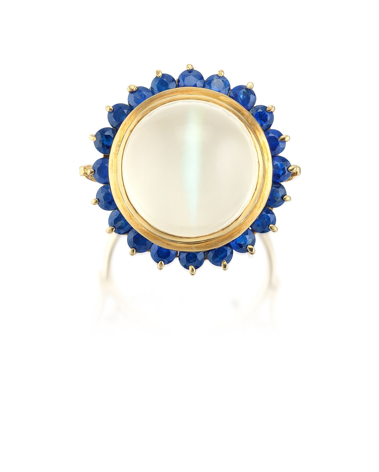 Collet-set with a cat's eye moonstone, within a circular-cut sapphire surround, mounted in yellow gold, size 6¾.