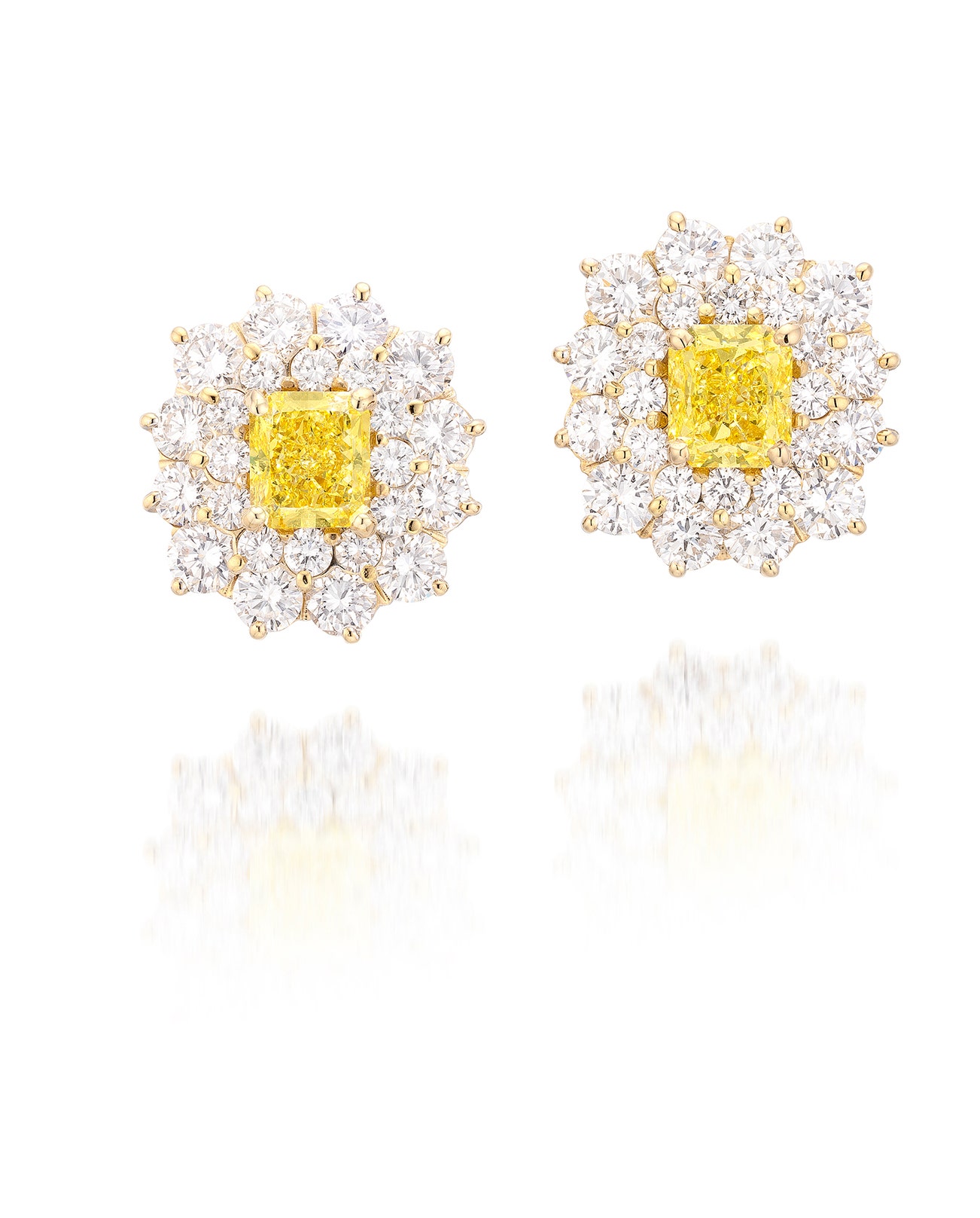 Each set with a cut-cornered rectangular modified brilliant-cut fancy vivid yellow diamond weighing approximately 1.60 and 1.69 carats respectively, within a double frame of brilliant-cut diamonds, mounted in yellow gold, post and omega back fittings, length approximately 17 mm.
