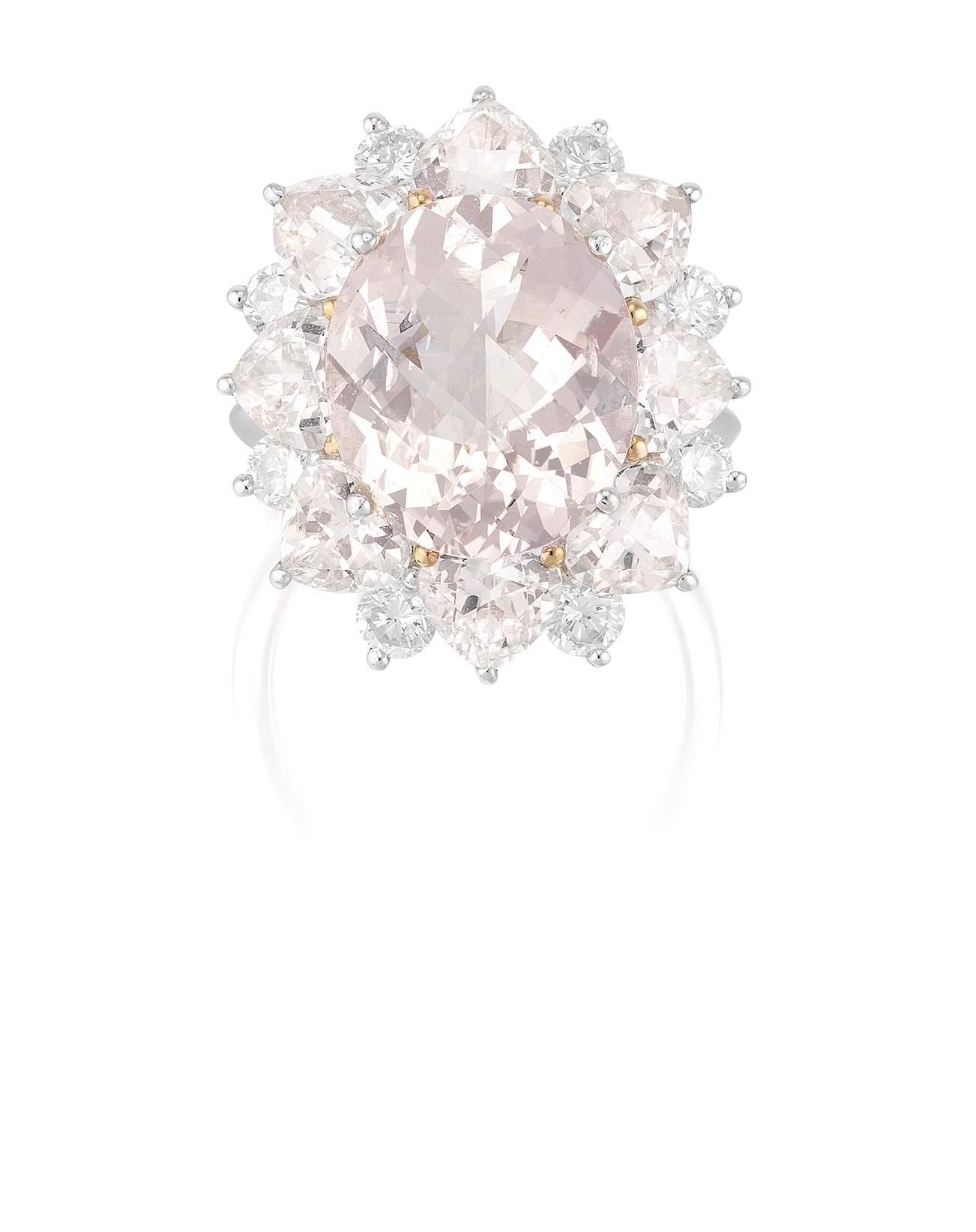 Set with an oval morganite, the surround set with alternating heart-shaped morganites and brilliant-cut diamonds, mounted in white gold, size 6¼.