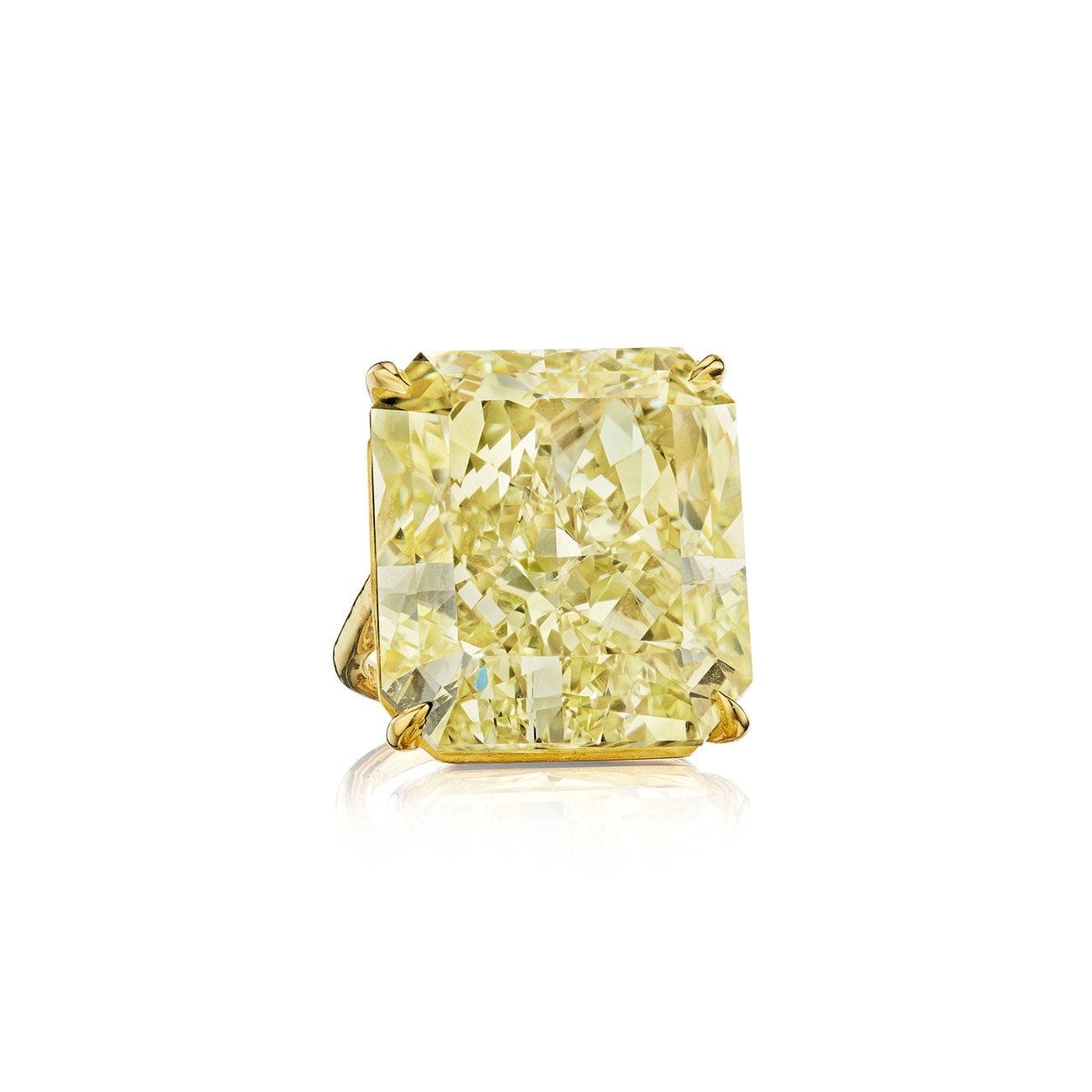 Set with a cut-cornered rectangular modified brilliant-cut diamond of fancy intense yellow color weighing 44.89 carats, mounted in 18K yellow gold, size 6.