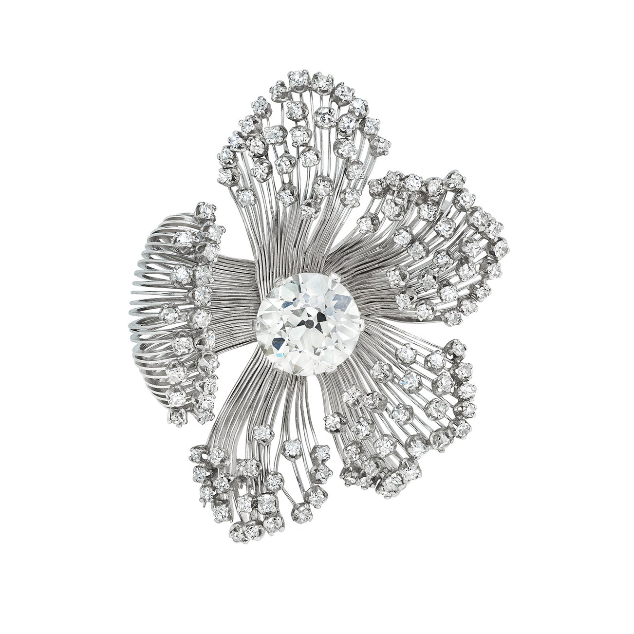 Designed as a flower, set with a circular-cut diamond weighing approximately 4.66 carats, the petals accented with single-cut diamonds, mounted in platinum.