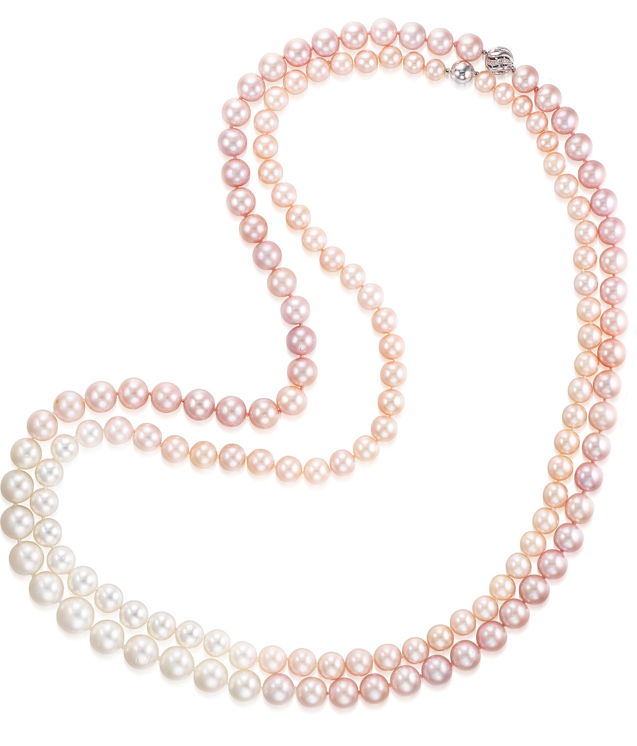 One necklace composed of sixty-seven graduated cultured pearls in shades of pink and white, measuring from approximately 11.00 to 15.10 mm, completed by a round clasp of openwork design, decorated with brilliant-cut diamonds, mounted in white gold, length approximately 880 mm; the second composed of seventy-seven graduated cultured pearls in shades of pink and white, measuring from approximately 8.80 to 12.50 mm, completed by a white gold ball clasp,mounted in white gold, length approximately 880 mm.