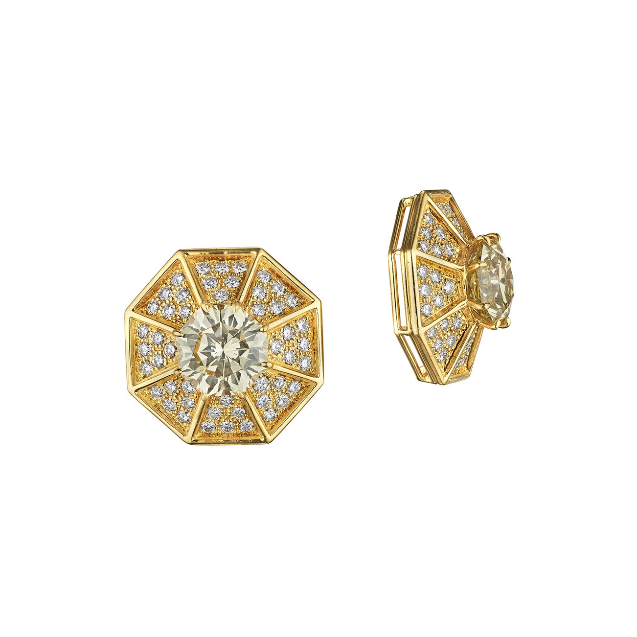 Each set with and octagonal-shaped diamond weighing approximately 3.14 carats and 3.37 carats respectively, surrounded by eight plaques set with brilliant-cut diamonds, mounted in 18K yellow gold, omega back fittings.