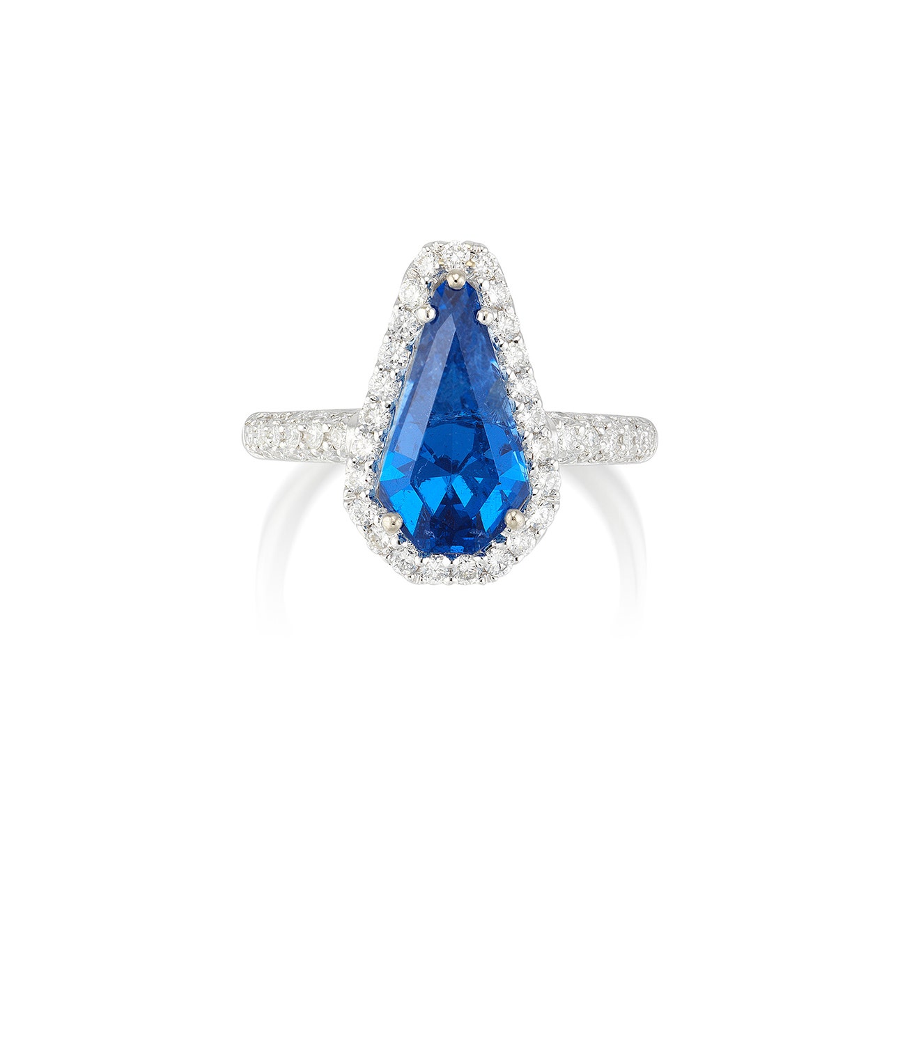 Set with a kite-shaped blue spinel weighing approximately 3.11 carats, within a brilliant-cut diamond surround and shoulders, mounted in white gold, size 5¾.