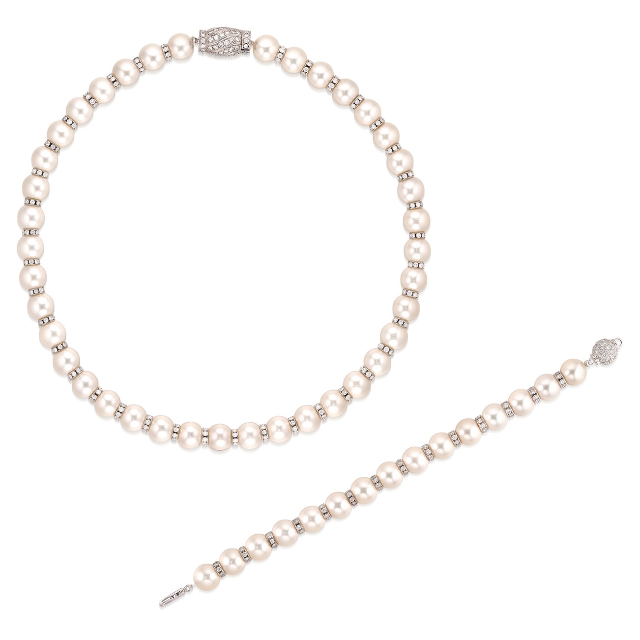 Comprising: a necklace composed of thirty-nine white cultured pearls measuring approximately 9.45 to 9.72 mm, spaced by diamond-set rondelles, completed by a white gold diamond-set clasp, length approximately 437 mm; and a bracelet of similar design composed of fifteen white cultured pearls measuring approximately 9.50 to 9.71 mm, completed by a white gold diamond-set ball clasp, length approximately 173 mm.