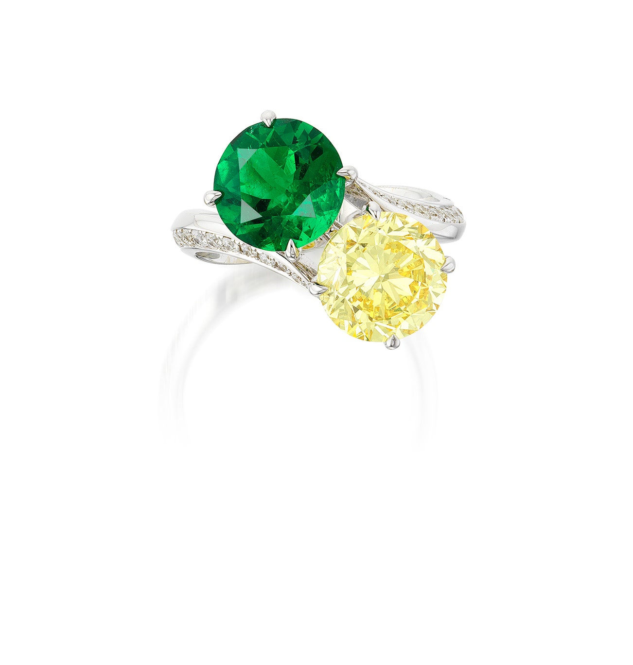 Of crossover design, set with a brilliant-cut fancy intense yellow diamond weighing 2.73 carats and a circular-cut emerald weighing approximately 2.18 carats, decorated by brilliant-cut diamonds, mounted in white gold, size 5¾.