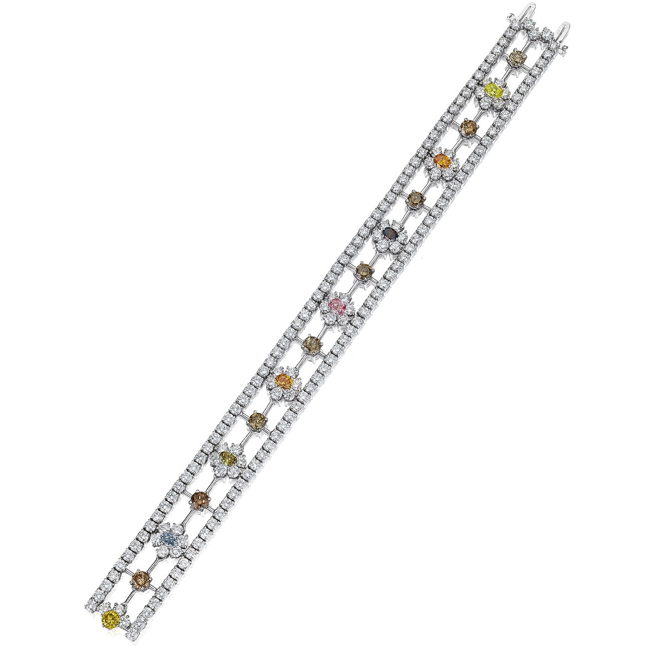 Set with an oval-shaped fancy intense blue diamond weighing 0.21 carat, an oval-shaped fancy intense purplish pink diamond weighing 0.31 carat, oval-shaped fancy deep purple brown diamond weighing 0.19 carat, an oval-shaped fancy bright yellow slightly brown orange diamond weighing 0.32 carat, brilliant-cut fancy bright yellow slightly green diamond weighing 0.34 carat, oval-shaped fancy bright orange slightly yellow diamond weighing 0.27 carat, oval-shaped fancy bright orange slightly yellow diamond weighing 0.30 carat, and an oval-shaped fancy bright yellow green diamond weighing 0.20 carat, each set within a fleurette of near-colorless brilliant-cut diamonds, alternating with brilliant-cut diamonds of brown tint, set between two rows of of brilliant-cut diamonds, mounted in 18K white gold, length approximately 7 5/16 inch, with French import marks and Italian maker's mark and assay mark.