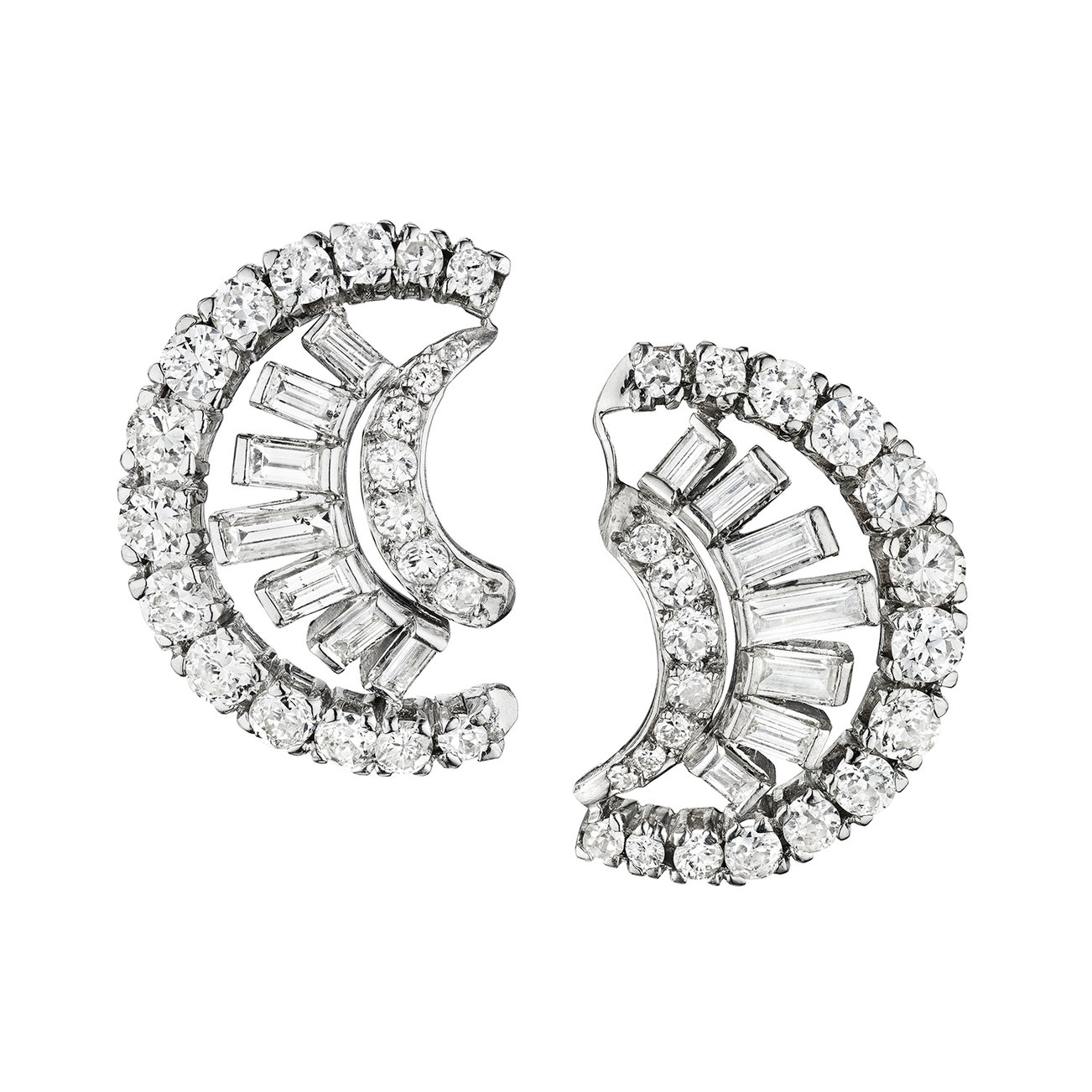 Each designed as a crescent motif, set with a graduated line of baguette diamonds between two rows of graduated circular-cut diamonds, mounted in platinum, posts and push back fittings.