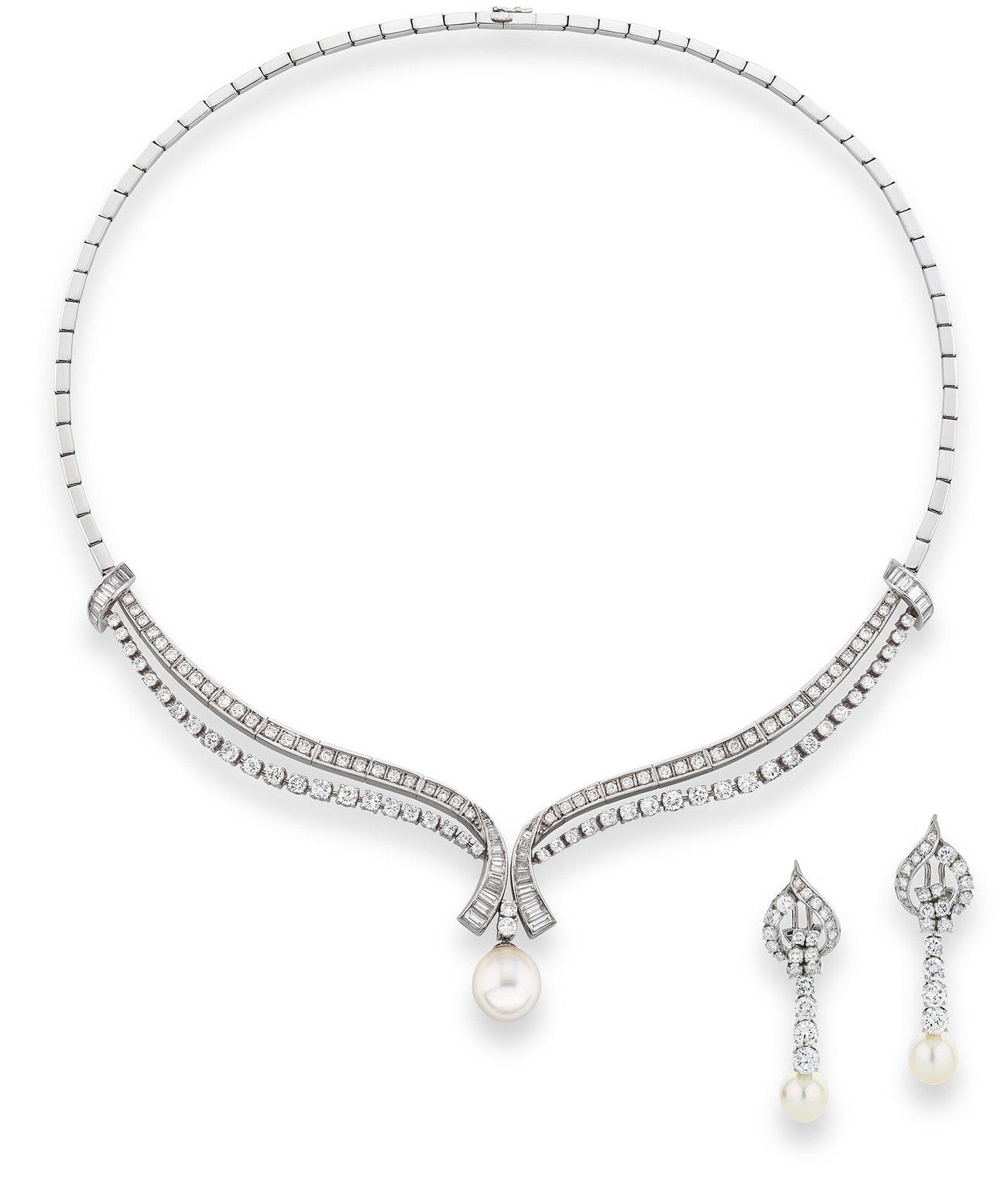 The necklace of ribbon design, supporting a cultured pearl, accented with graduated brilliant-cut and baguette diamonds, length approximately 465mm; each earring set with a cultured pearl, suspended from a line of graduated brilliant-cut diamonds, the ribbon-shaped surmount set with graduated brilliant-cut diamonds, length approximately 45mm.