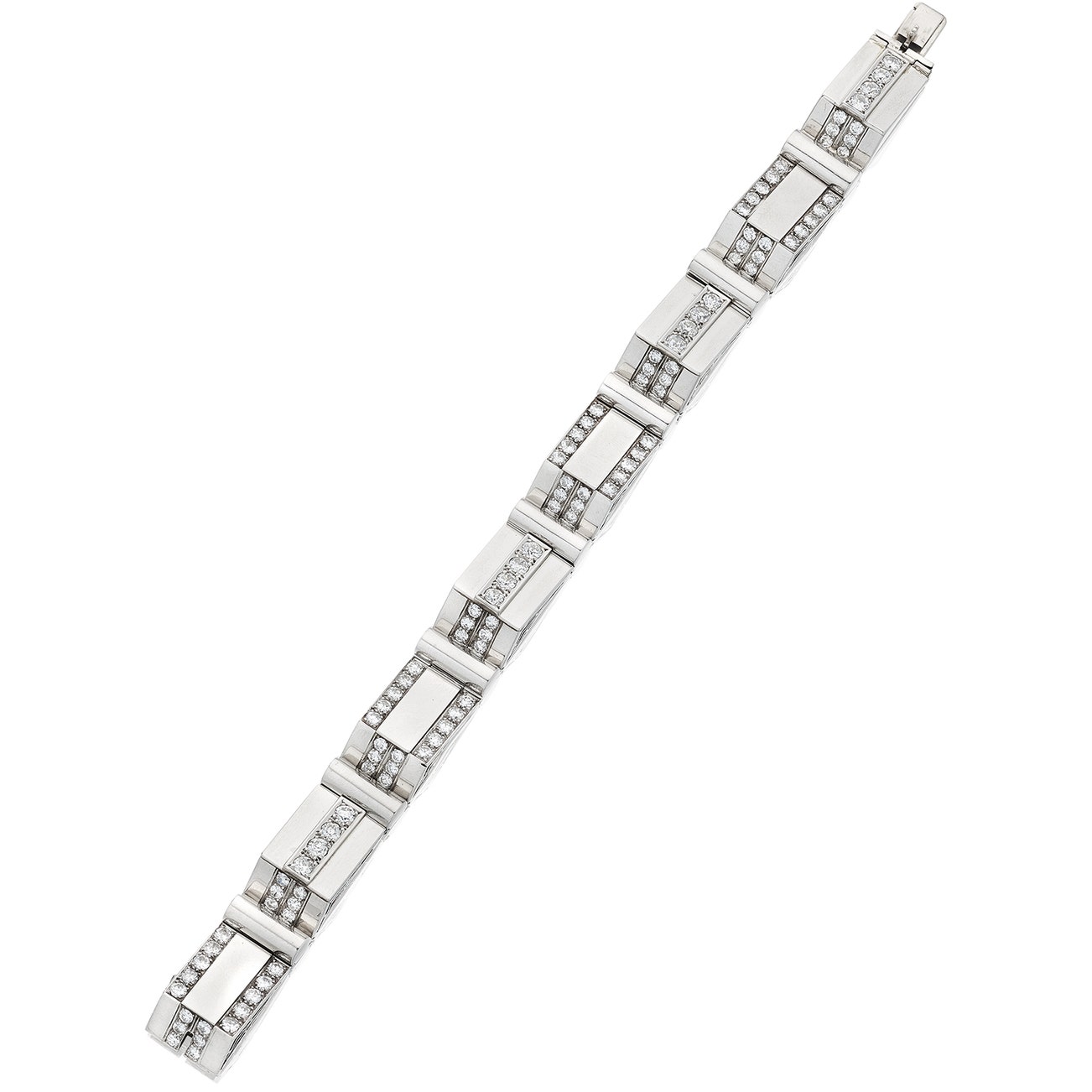 Composed of stepped links accented by circular-cut diamonds, mounted in platinum, length approximately 7 inches.