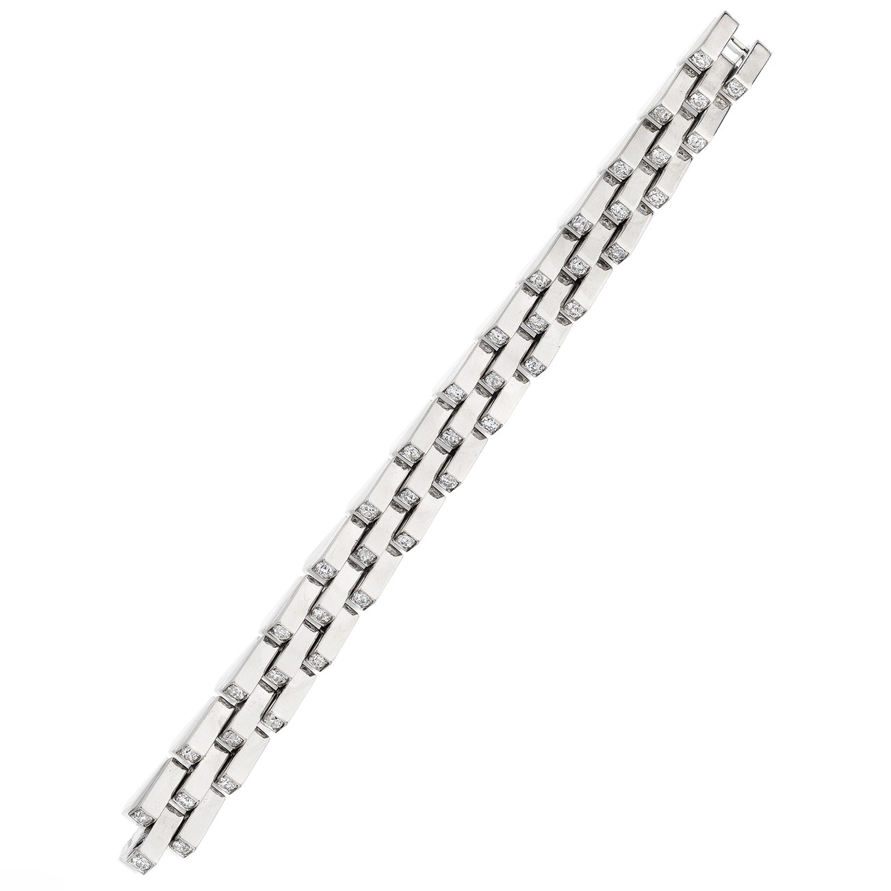 Designed as a moving staircase, each link set with a circular-cut diamond, mounted in platinum, length approximately 7 1/4 inches.