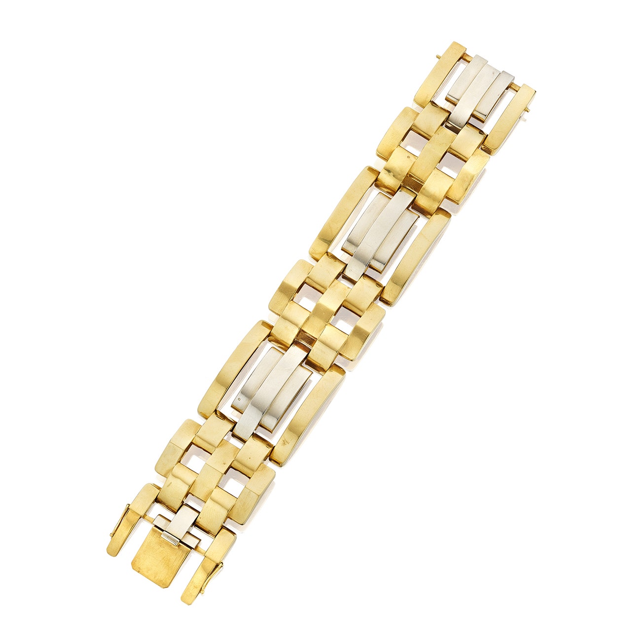 Designed as geometric links, mounted in 18K white and yellow gold, length approximately 7 1/4 inches, with French assay mark.