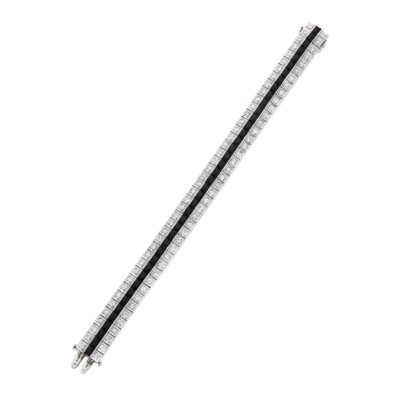 Set with a line of French-cut onyx, flanked by rows of circular-cut diamonds, mounted in platinum, length approximately 7 1/8 inches.