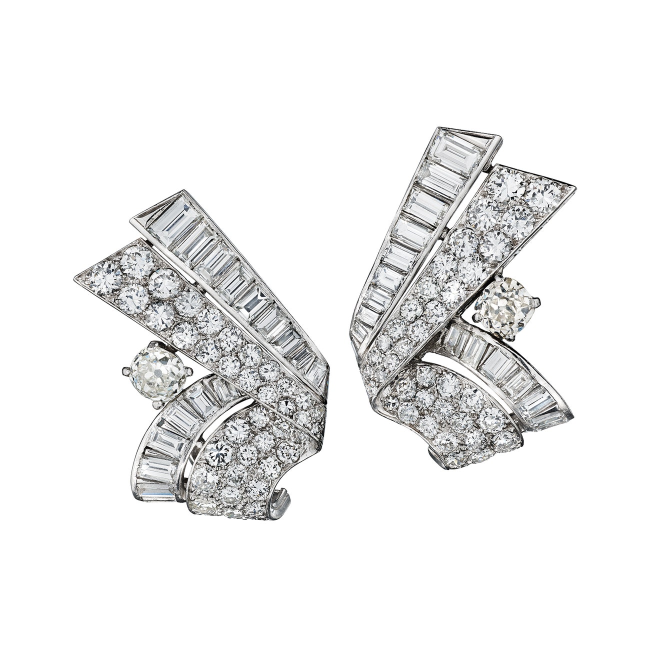 Each of ribbon motif, set with circular-cut and baguette diamonds, accented by a cushion-cut diamond, mounted in platinum, length approximately 1 1/4 inches, posts with hinge back findings.